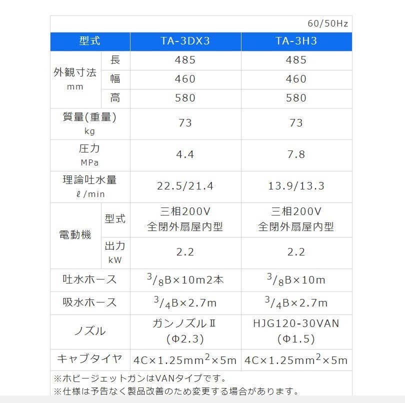 【商品詳細】 【有光 TA-3H3 モータータイプ 200V 】 外観寸法 長×幅×高 mm :485×460×580 質量(重量) kg :73 圧力 Mpa :7.8 理論吐水量 l/min : 13.9/13.3 電動機 :三相200V 全閉外扇屋内型 / 2.2kw 吐水ホース / 吸水ホース :3/8B×10m / 3/4B×2.7m ノズル / HJG120-30VAN (Φ1.5)/ 4C×1.25mm2×5m ■写真は、イメージです。 メーカーホームページはこちらから有光工業株式会社 重量物は法人様のみ車上渡し元払いになります。 個人様は、運送会社様の営業所止めになります。 ※仕様は予告なく変更になることがございます。 ※下記注意事項の確認をお願いいたします。