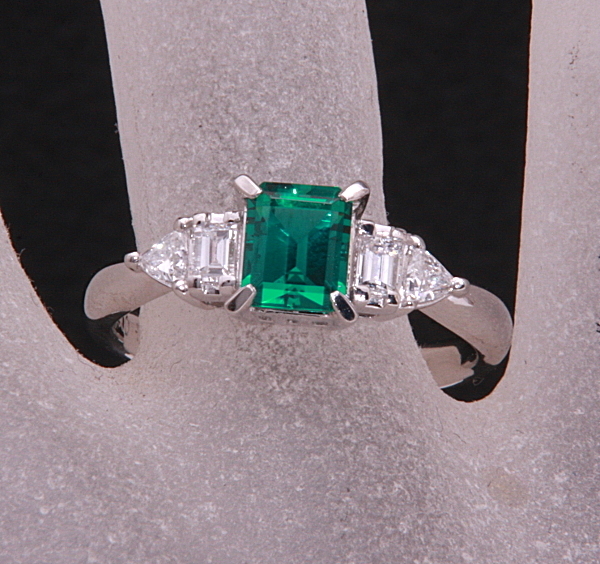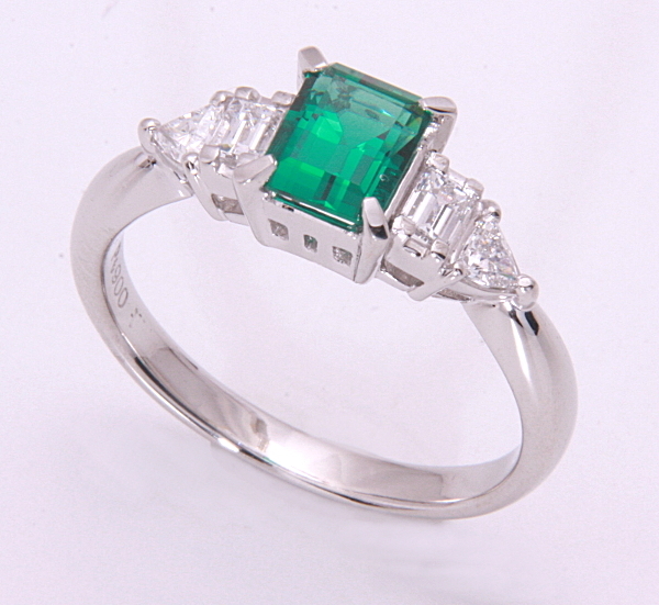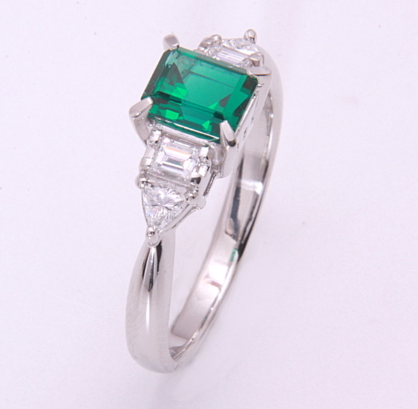 0.63ctの合成エメラルドと、天然ダイアモンドが4石輝くリングです。