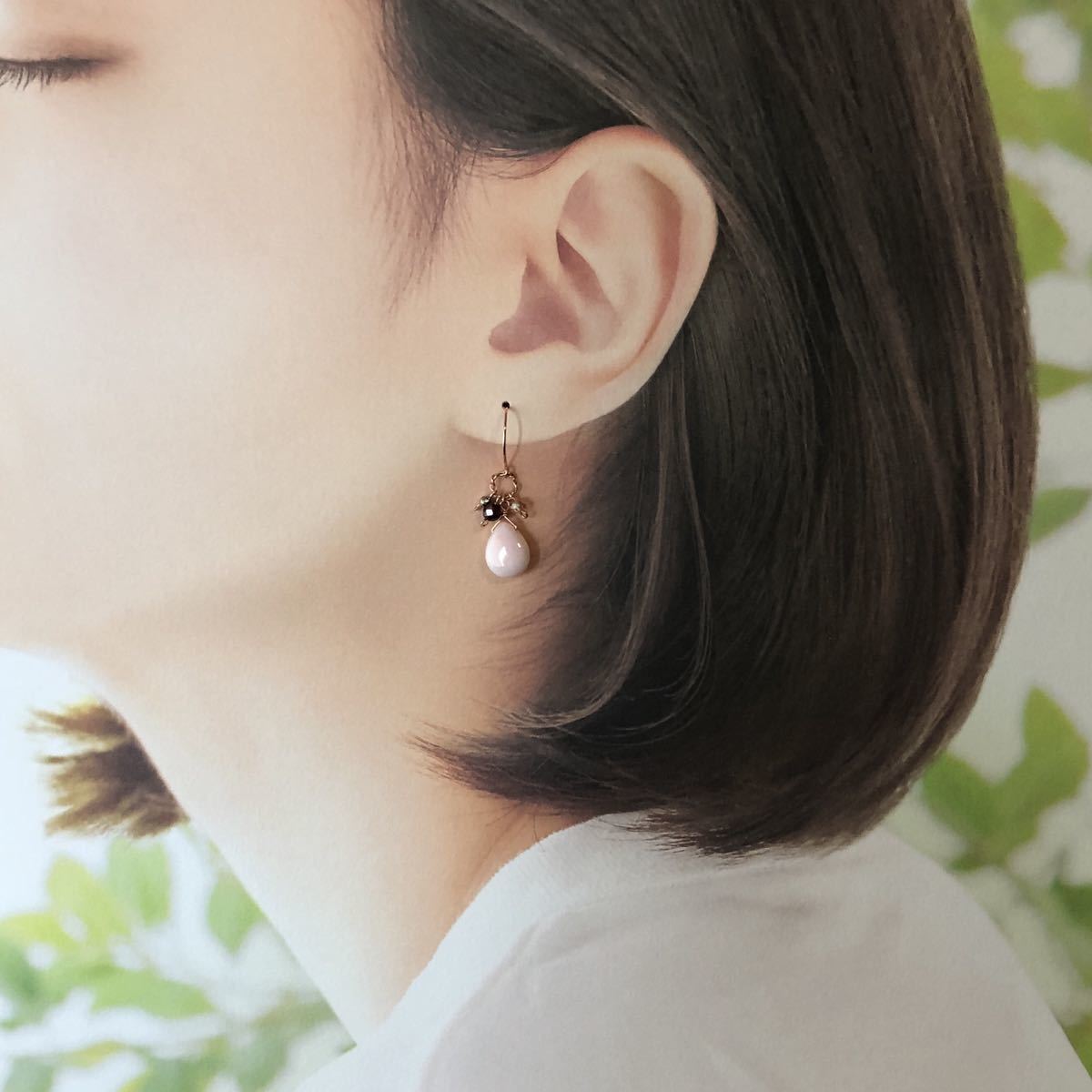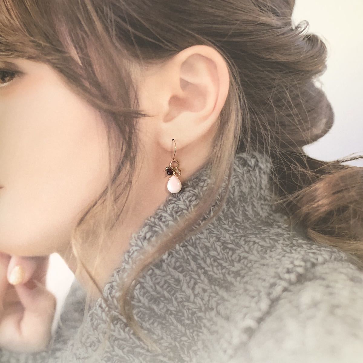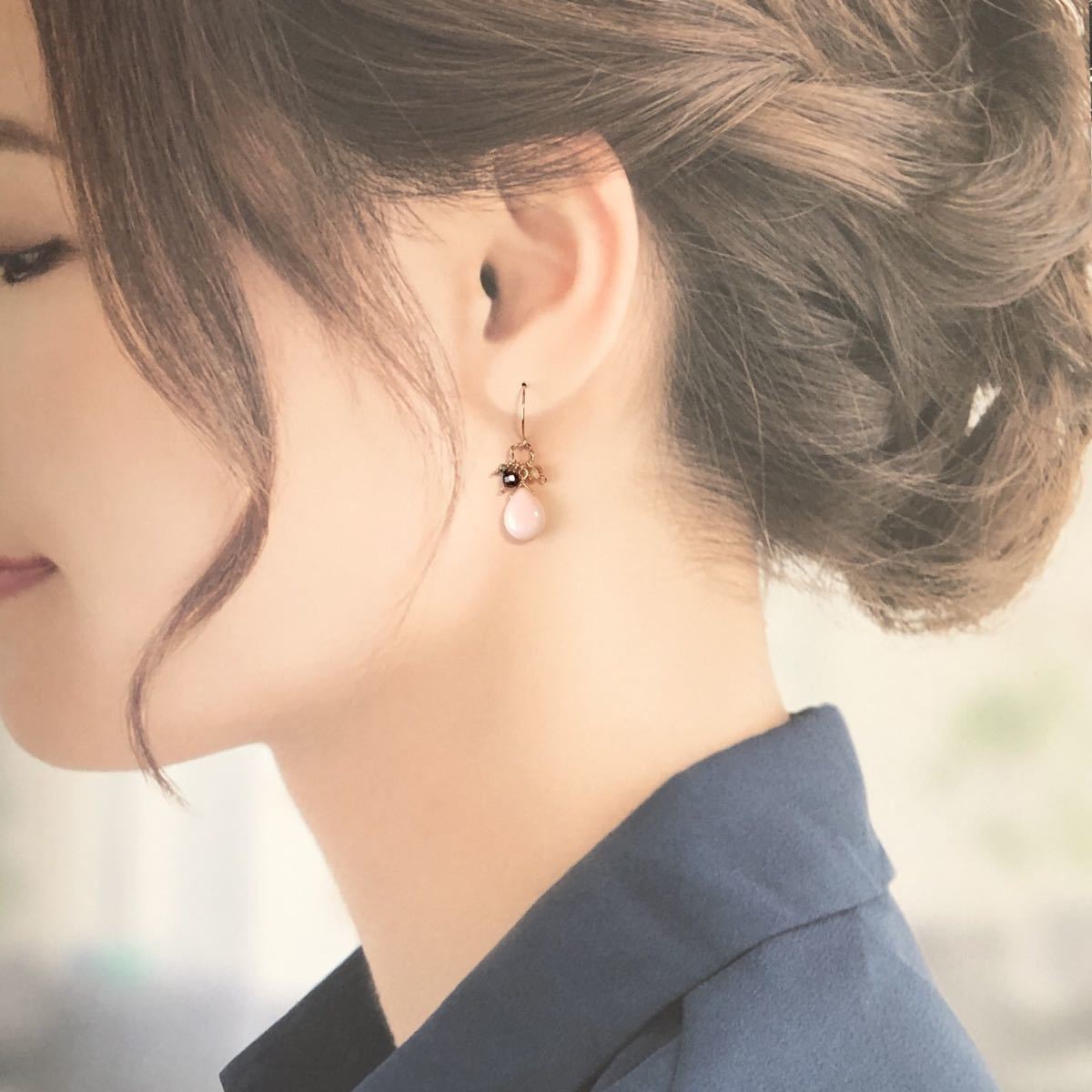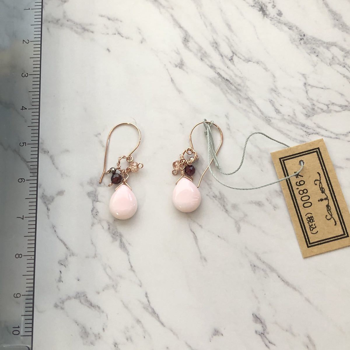 艶々ぷっくりで可愛らしいクイーンコンクシェルのピアスです。柔らかいピンク色で優しい雰囲気です。引き締めにロードライトガーネットやパイライトが使用されています。