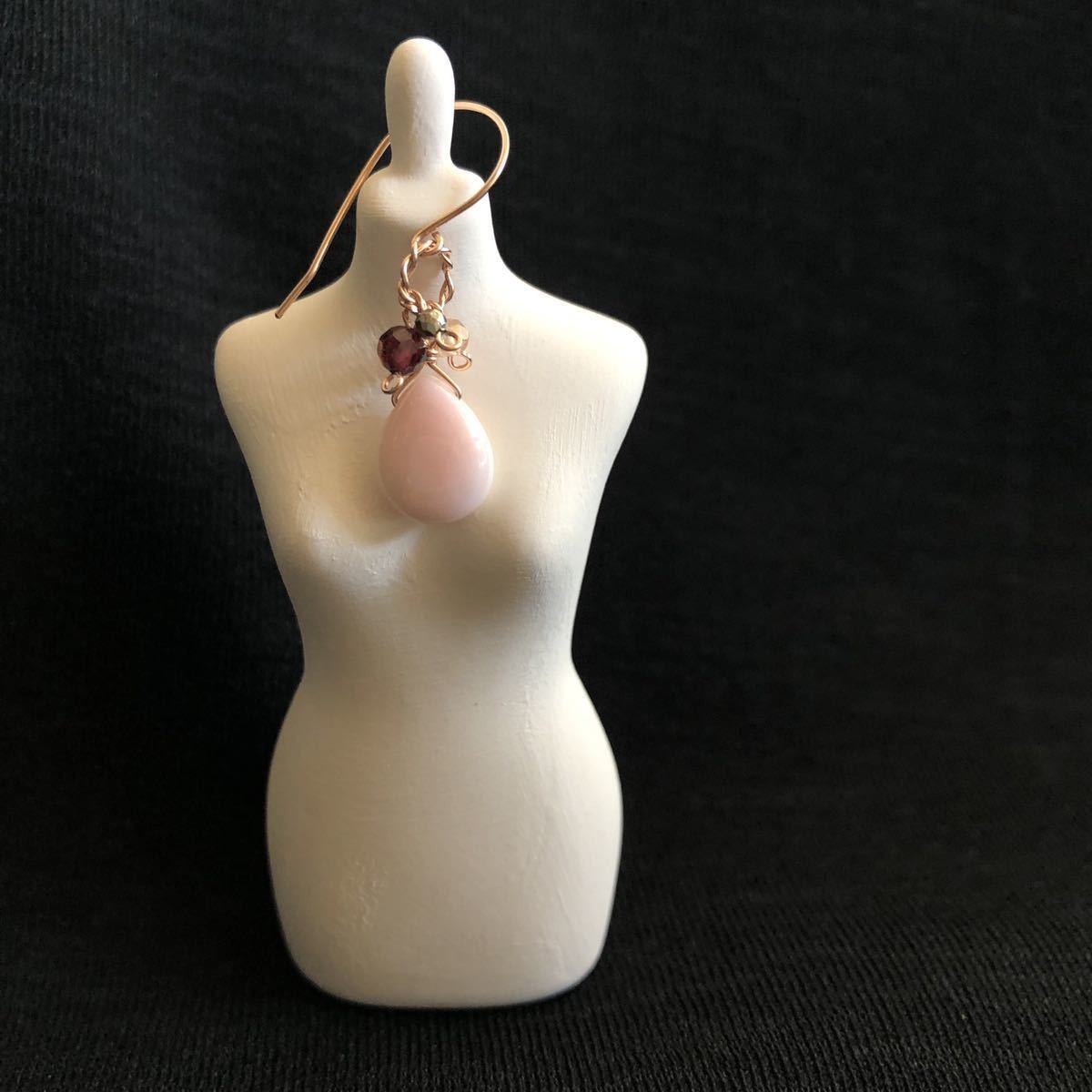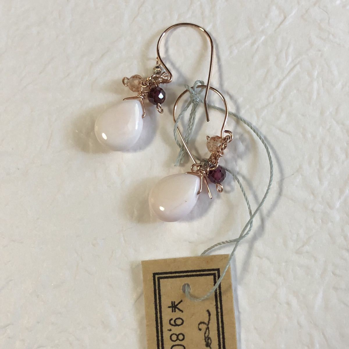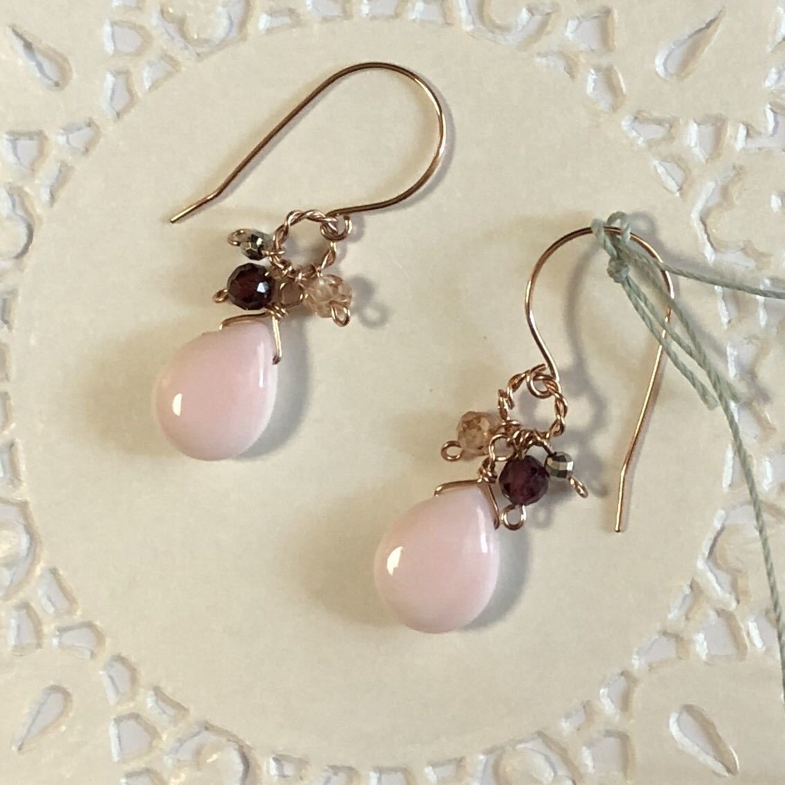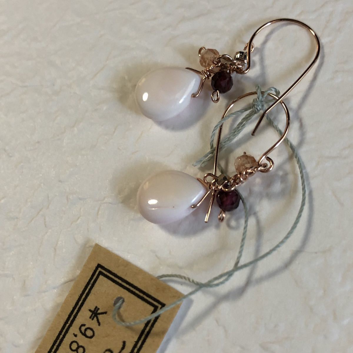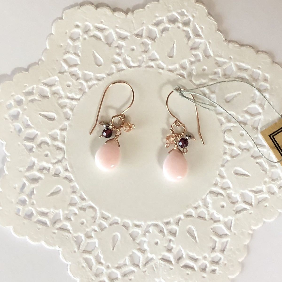 艶々ぷっくりで可愛らしいクイーンコンクシェルのピアスです。柔らかいピンク色で優しい雰囲気です。引き締めにロードライトガーネットやパイライトが使用されています。