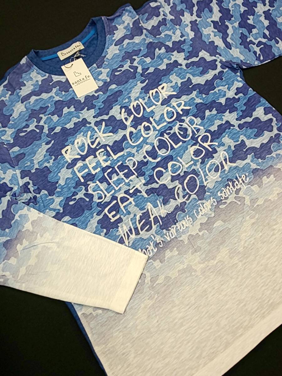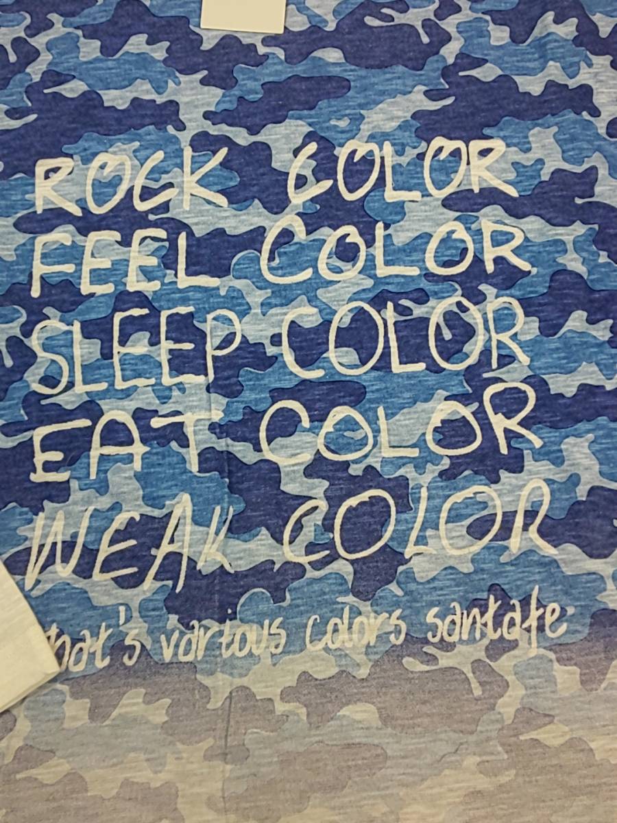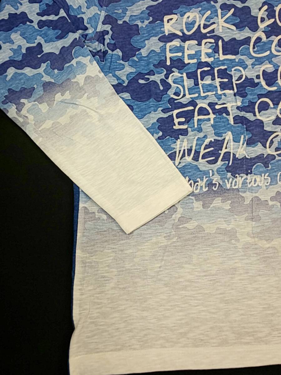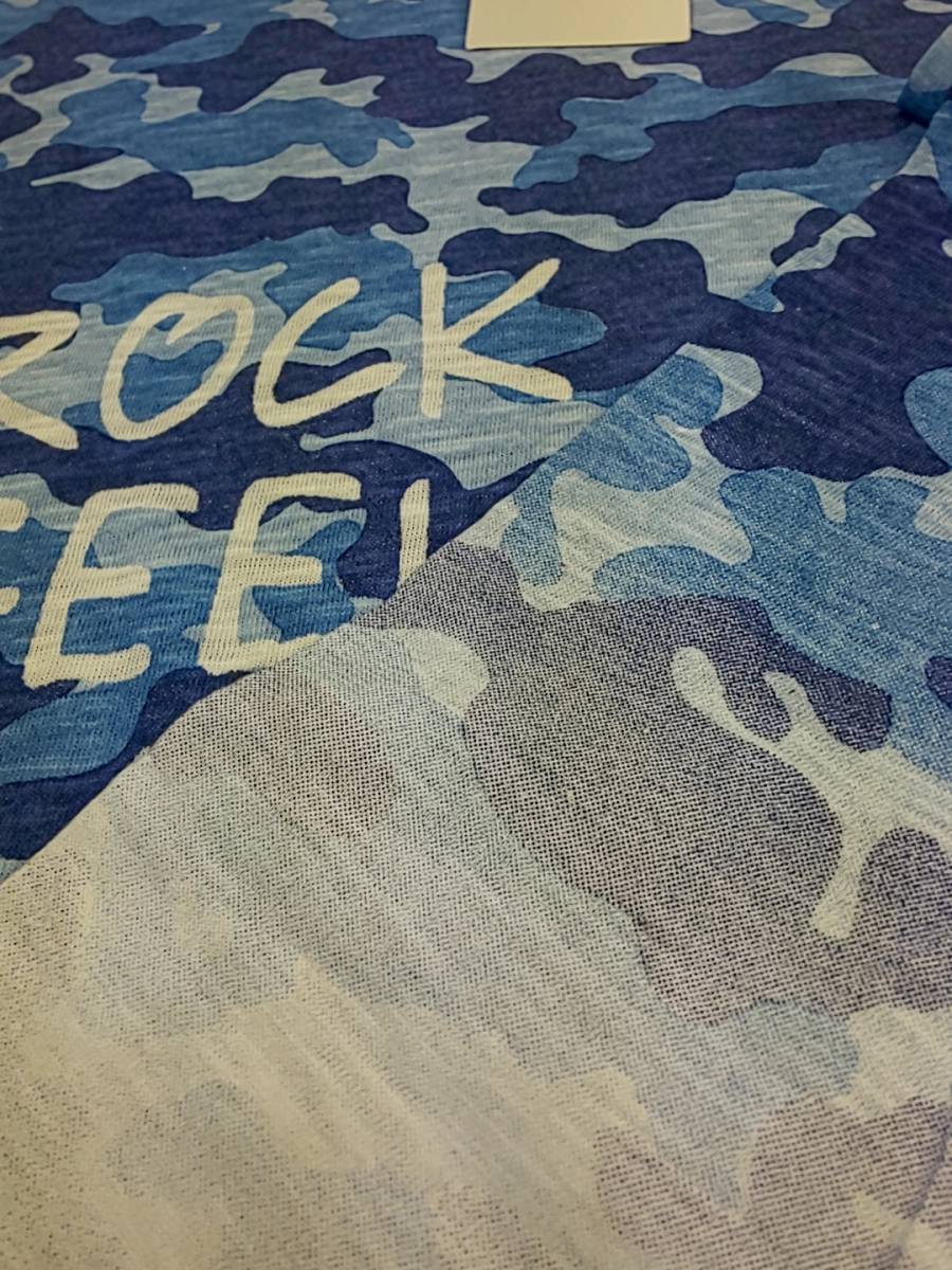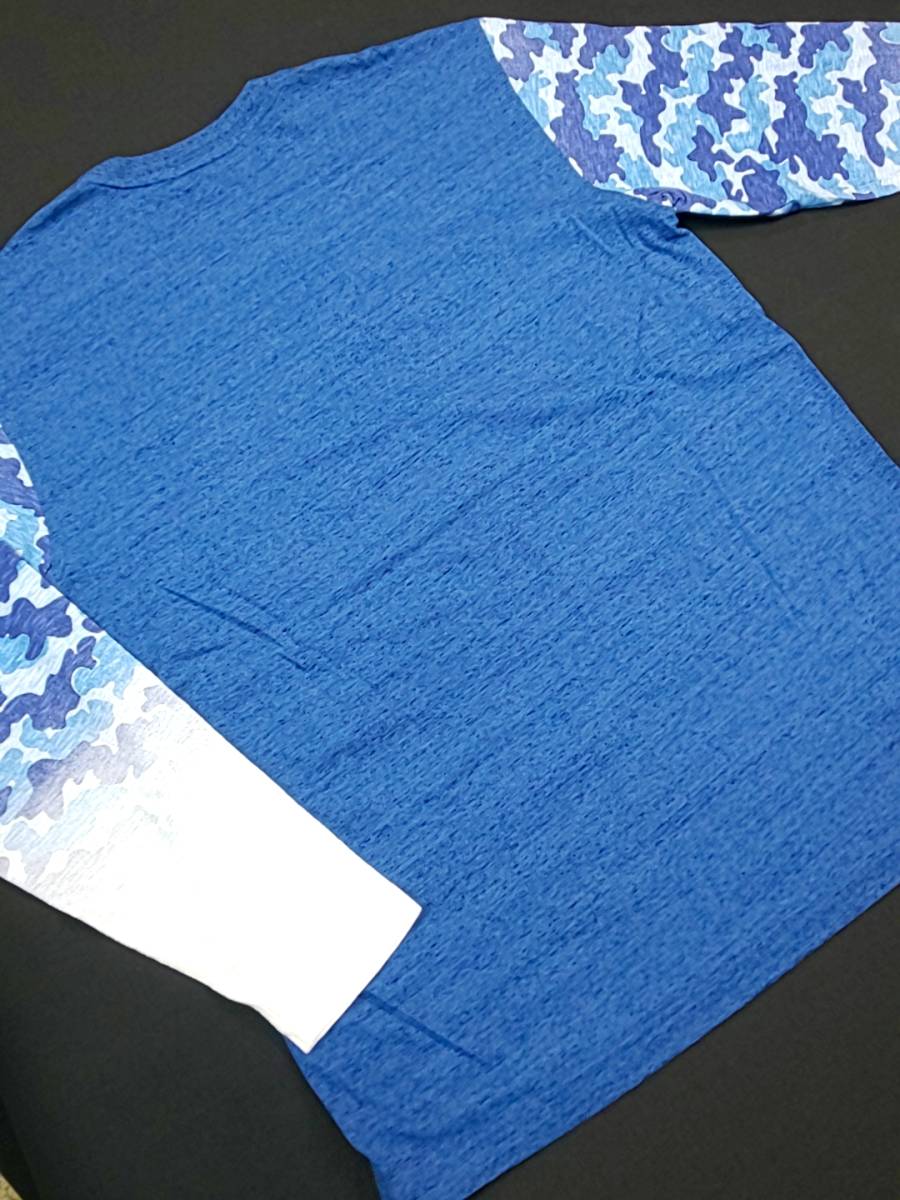 綺麗なブルー系迷彩柄のグラデーションに胸の白のロゴのプリント生地がインパクトある