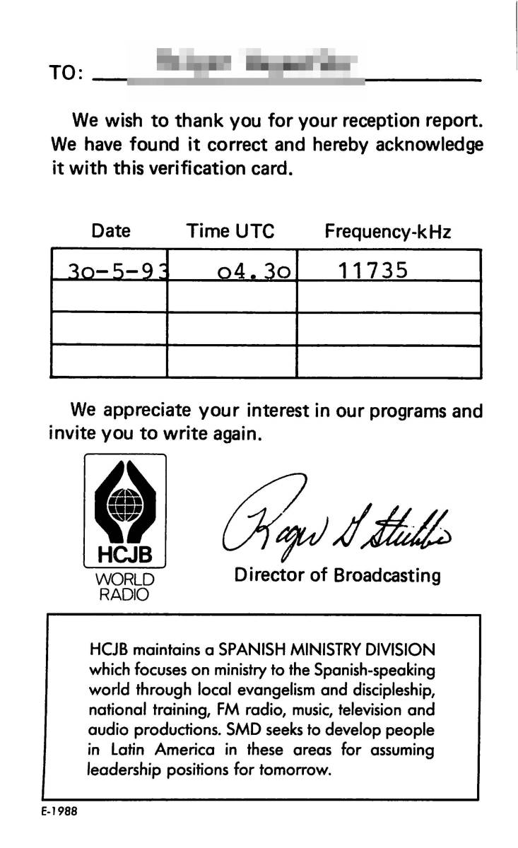 | 【商品名】・・・HCJB(★アンデスの声)のベリカード。 【コメント】・・・かつて日本語放送を行っていた事はあまりにも有名ですね! 【国名・地名】・・・エクアドル★首都 キト。 【受信データ】・・・1993年5月30日・SW11735KHZを受信。 【記載事項】・・・受信データ・受信者の氏名が記載。 【状態】・・・シワ、汚れ、シミ、焼け、色あせ等があります。 ■カードの状態は★画像を参考に判断して下さい。 ■この機会にぜひこのベリカードを貴方のBCLコレクションに加えて下さい! 【おまけ】・・・SONY・取扱説明書(PDF版)1機種を無料で添付します。 ★ワールドゾーン33★CRF-330Kのカラー日本語取扱説明書。(★日本語ページのみ) ★CD-Rに焼いてベリカードと一緒に同封致します。 ★PDFにパスワードを掛けておりPCで閲覧は可能ですがプリンターで印刷はできません! | |
