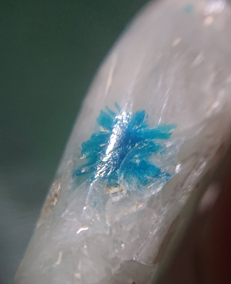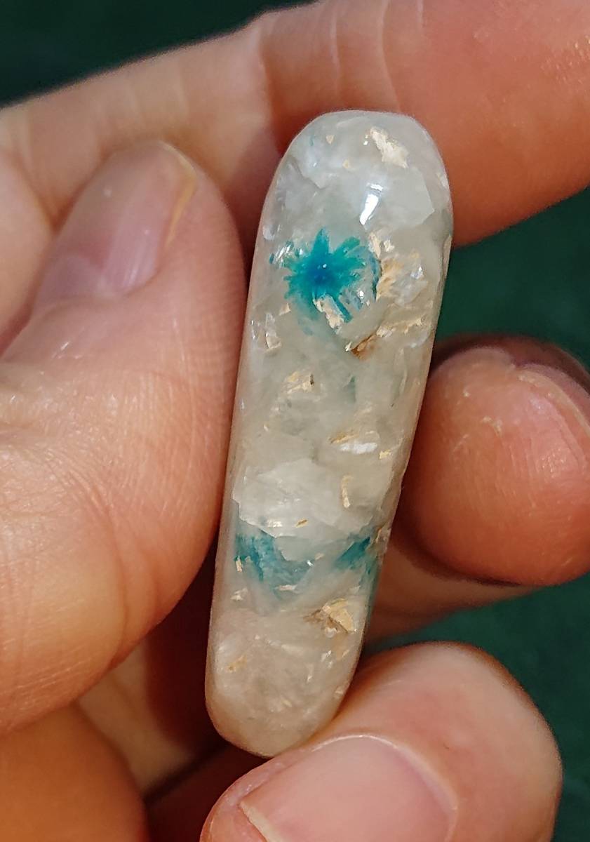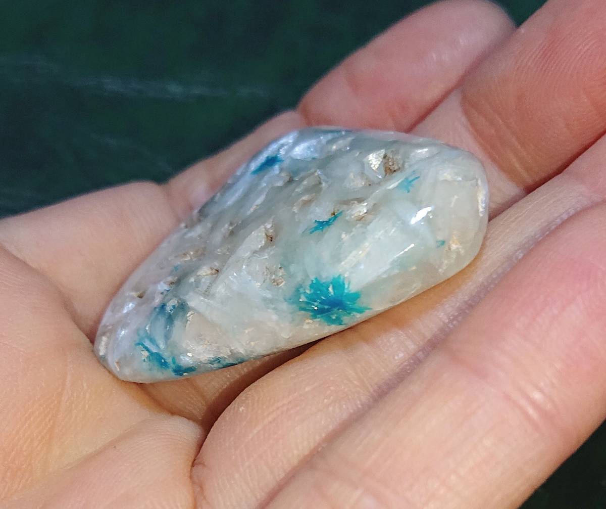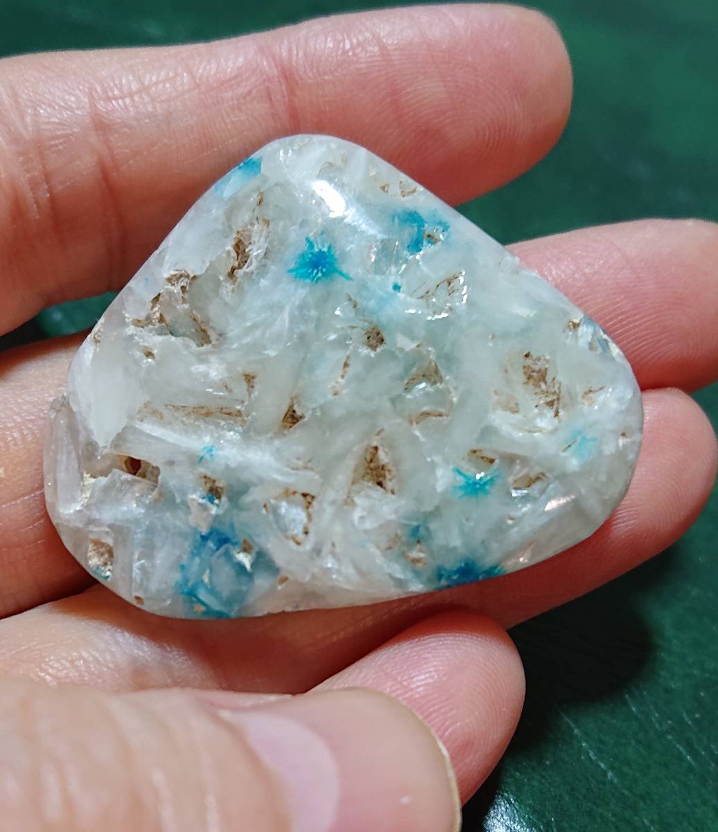 束沸石の塊の研磨も珍しい気がしますが、ペンタゴン石が束沸石の中にここまで入り込んでいる状態を見られるのも研磨してこそではないでしょうか。青い花のように見えるのも美しいです。