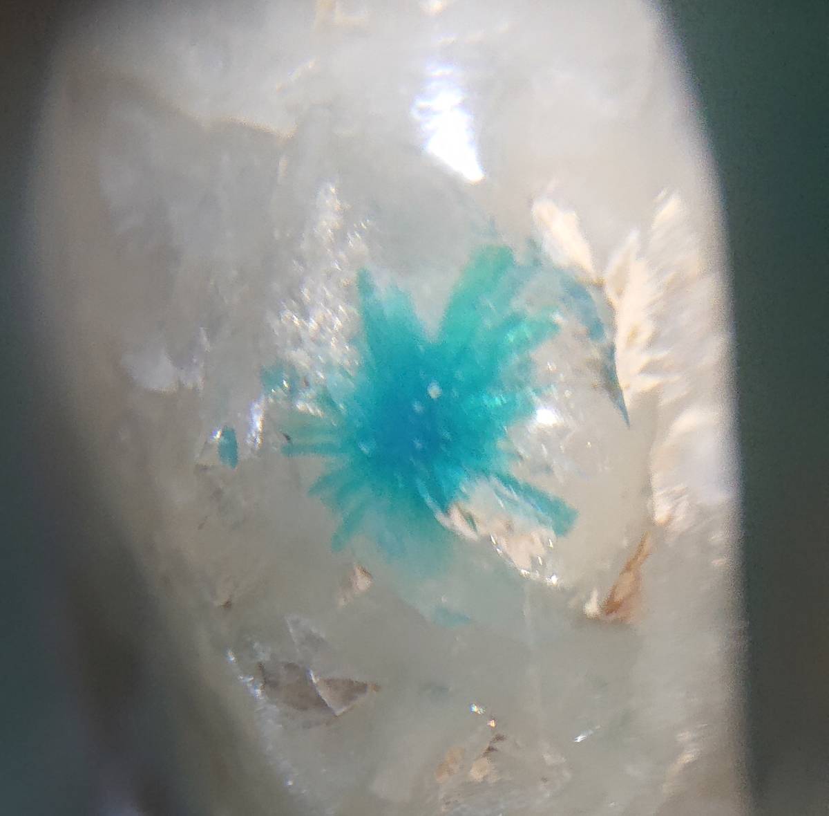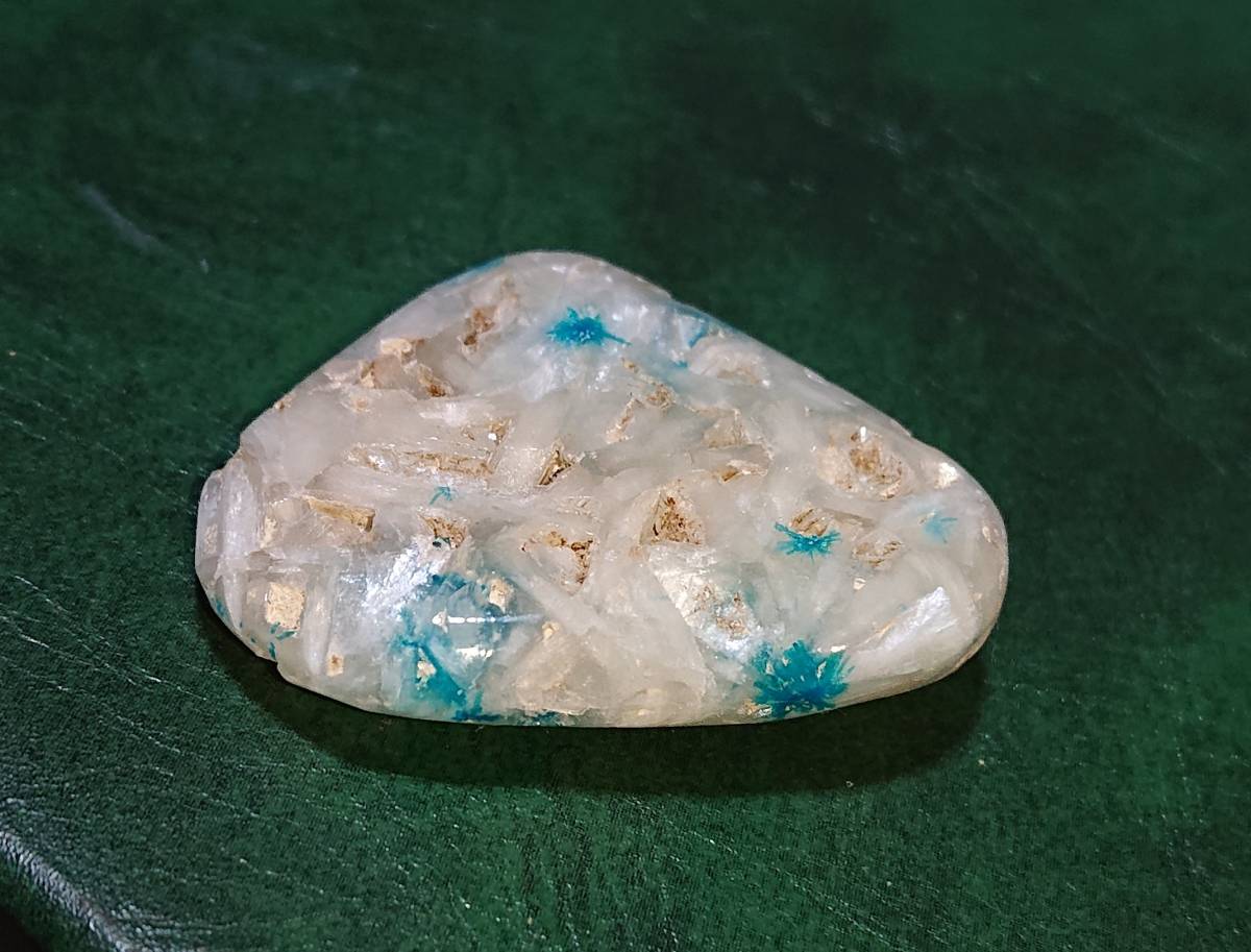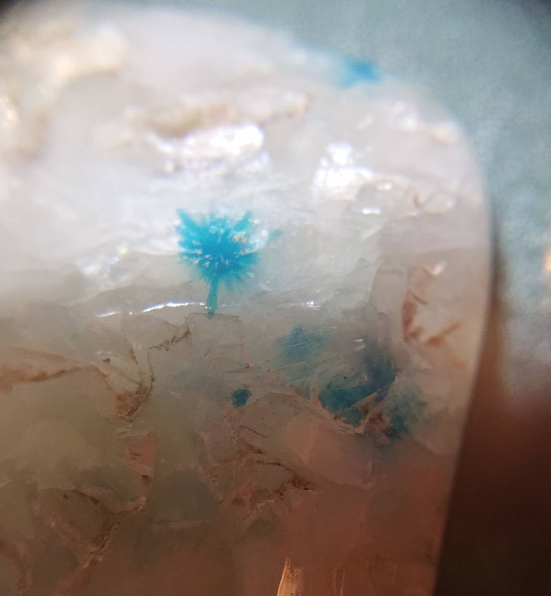 束沸石の塊の研磨も珍しい気がしますが、ペンタゴン石が束沸石の中にここまで入り込んでいる状態を見られるのも研磨してこそではないでしょうか。青い花のように見えるのも美しいです。