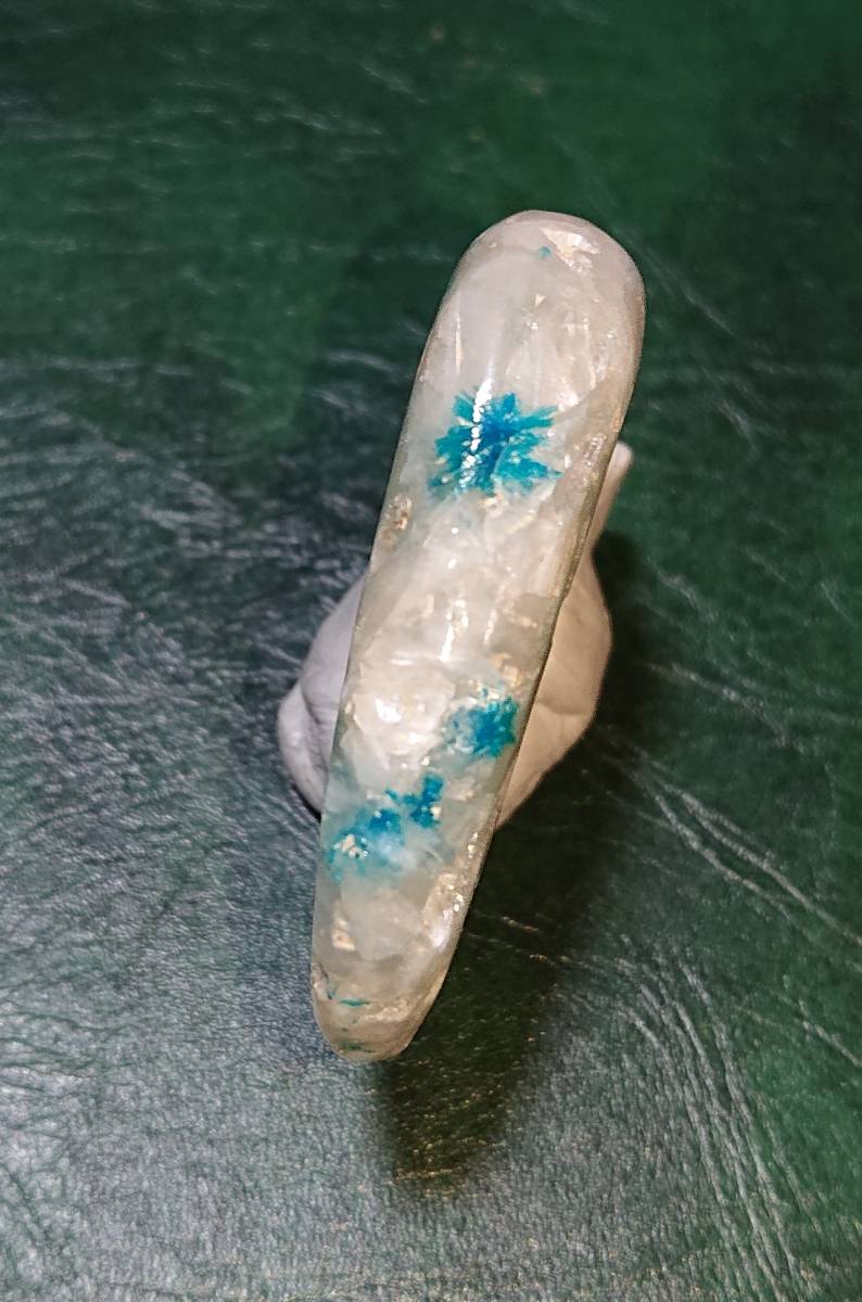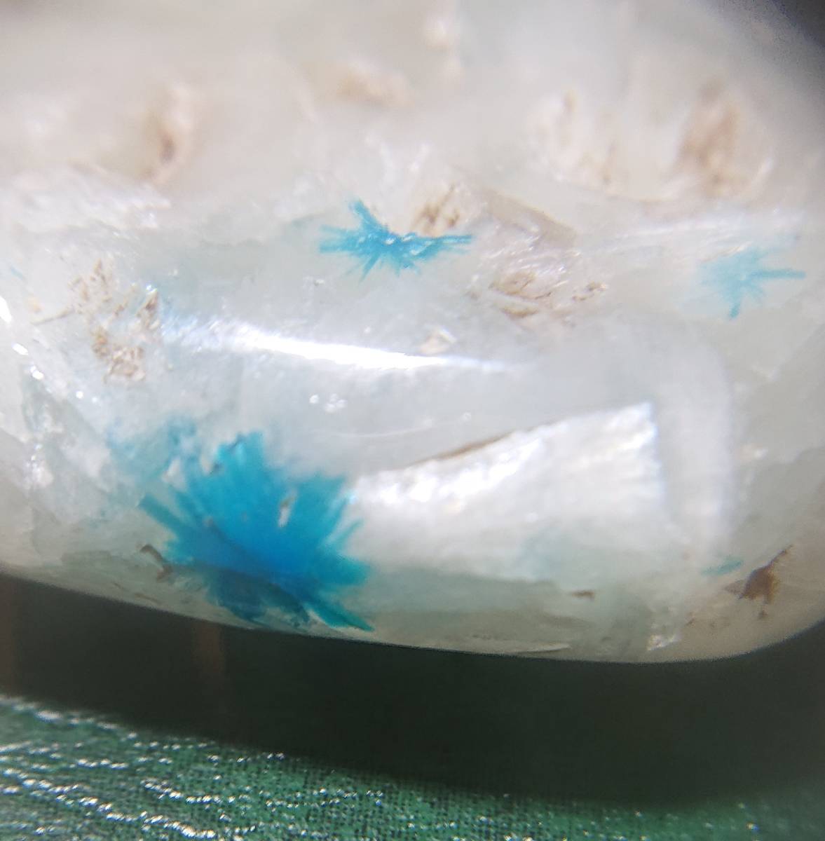 自然の産物なので天然石としての凹み、ヒビや欠けのみられる部分、他の鉱物の茶色っぽい粉末の付着等があります。