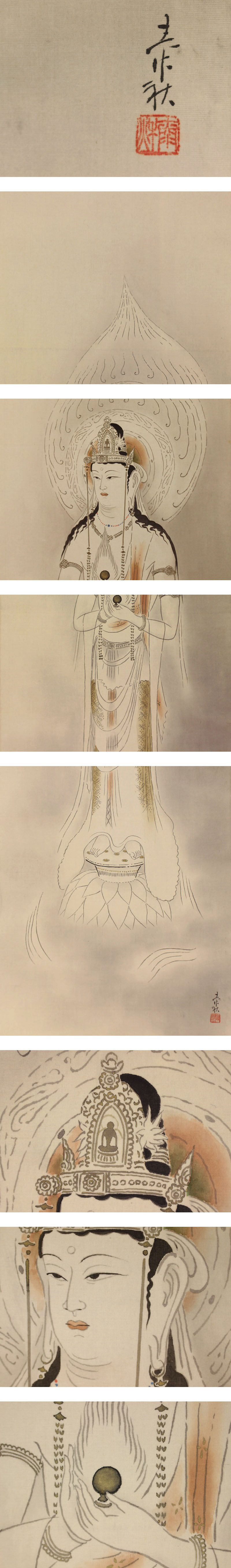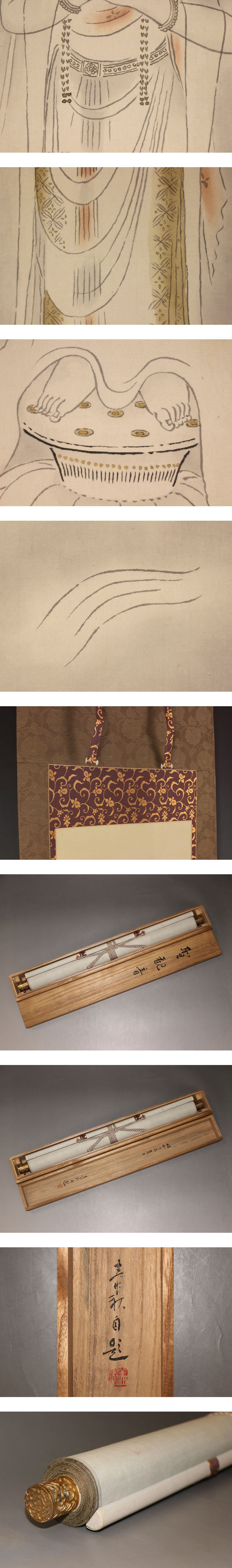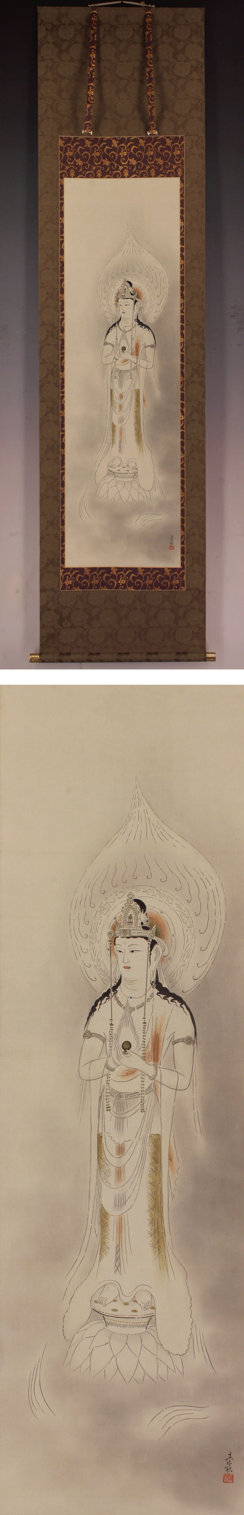 金子泰秋【聖観音】 本紙は、軽い染みがあります。 表装は、軽い皺があります。 【サイズ】 作品 横約36cm×縦約121.5cm 表装 横約52cm×縦約203.5cm |