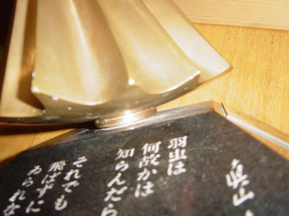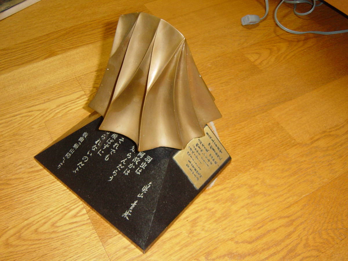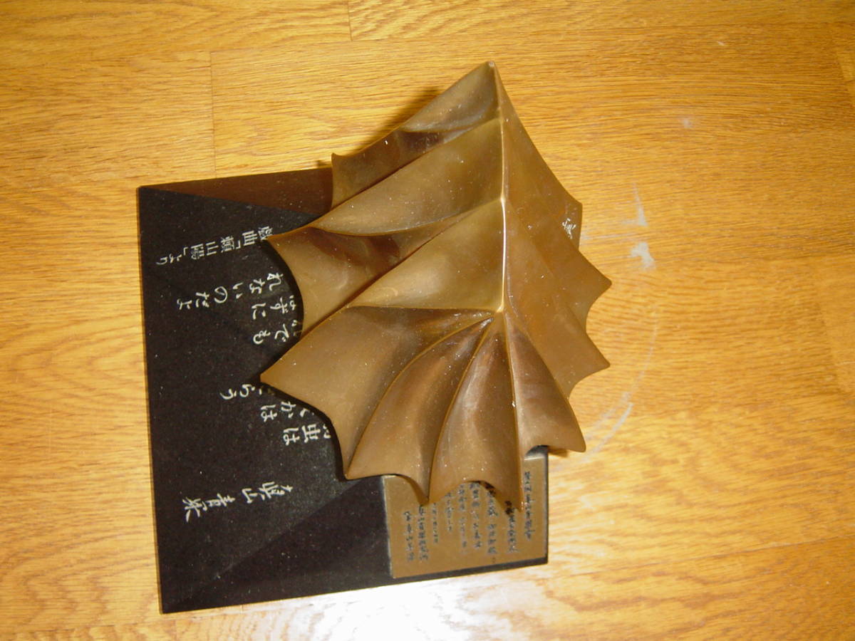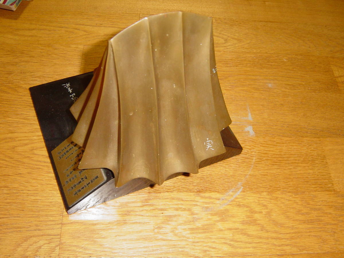 ◇1986年第5回眞山青果大賞:第四代中村雀右衛門受賞記念盾(記念品)◇です。サイズ:約21.5×17.5×高さ21cm、重さ約6580g。オブジェ刻印”実”。オブジェ部分に若干の傷等があります。写真7・8のように大理石らしき台座に欠落があります。オブジェは回転します。1986年青果大賞、1991年人間国宝、2004年文化勲章。歌舞伎俳優・映画俳優。写真のものが全てです。私見ですが経年よる汚れ・傷等があります。写真で判断願います。中古品ですので,新品同様なものをお求めの方・気になさる方のご入札はご遠慮願います。ノークレーム、ノーリターンでお願いいたします。送料はゆうパック80サイズの料金です。発送は原則週2回です。お手数をおかけしますがご入札の前に、必ずフォローリスト(自己紹介欄)と当該記載内容のご確認をお願いいたします(2日以上連絡がつかないときも,お手数をおかけしますがフォローリスト(自己紹介欄)をご覧の上ご連絡をお願いいたします)。中古品でございますのでノークレームでお願いいたします。問題発生時の対応につきましては、誠意をもって対応させていただきます。メールをいただければ5日程度の取置き(同梱)はOKですのでぜひご利用ください。落札後7日以上連絡が取れないときは自動的にキャンセルさせていただきます。(注)①迅速に対応するため、“「取引ナビ」:取引メッセージ”でお願いいたします。②ゆうパック(着払いの対応はいたしません)ご利用の場合、請求送料は郵便局への持込み割引を含み一切割引の無い料金とさせていただきます(実際の発送料金とは、120円の差があります)。③状態の判断はあくまでの私見ですのでご理解願います。④評価の悪いが5個以上の方、新規の方は、お取引を確実にしていただける旨ご連絡ください。ご連絡のない場合は削除させていただきます。⑤ご入札後のキャンセルはできませんので十分に注意してご入札に参加願います。⑥領収書の発行はできません万一、落札品が欠品・不具合で取引出来ない場合は,誠に申し訳ありません。実費(ご落札金額、送料、振込手数料)のみにて対応させていただきます。【必ず自己紹介をお読みください。対応や発送できない期間などご案内しております】