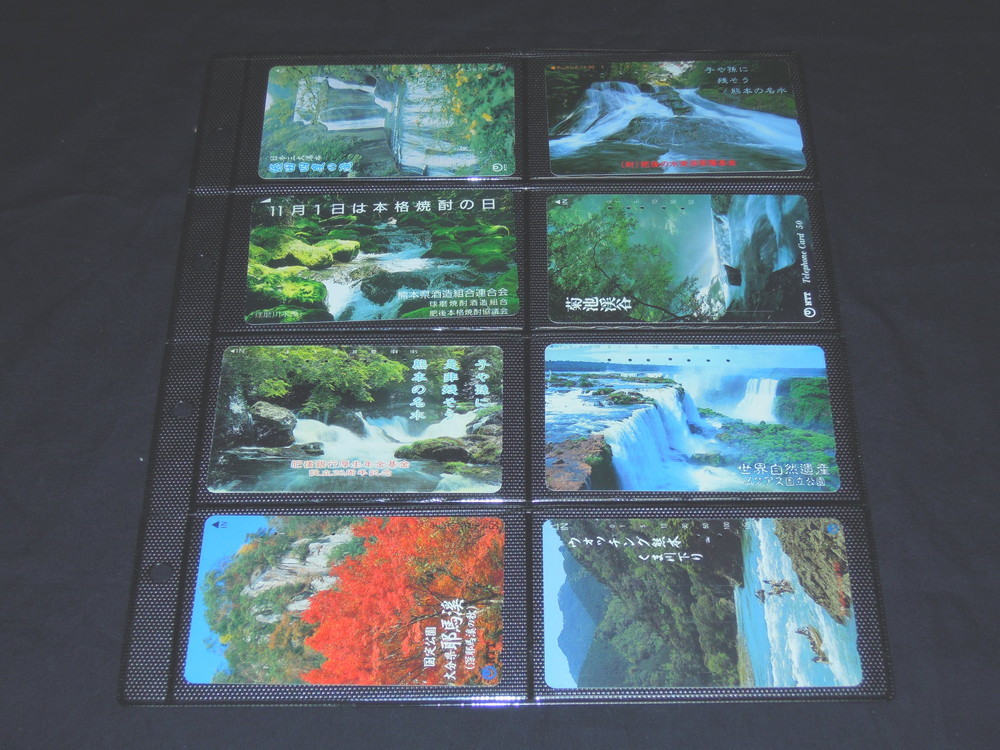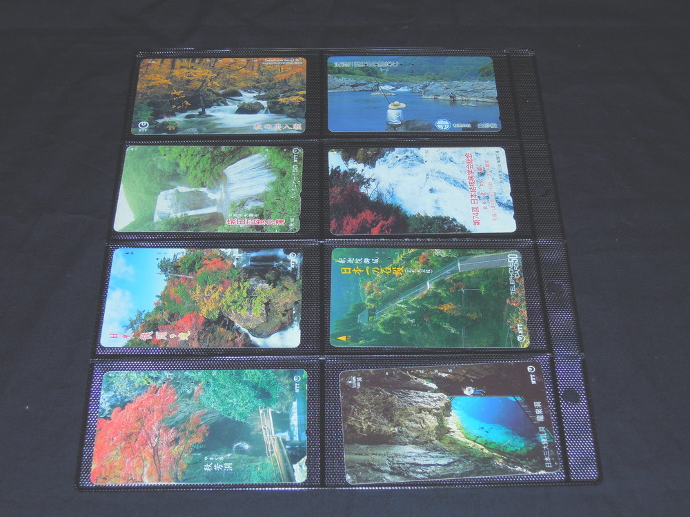 川・滝・渓谷がデザインされた使用済テレホンカード16種です。新品のフォルダに整理してあります。
