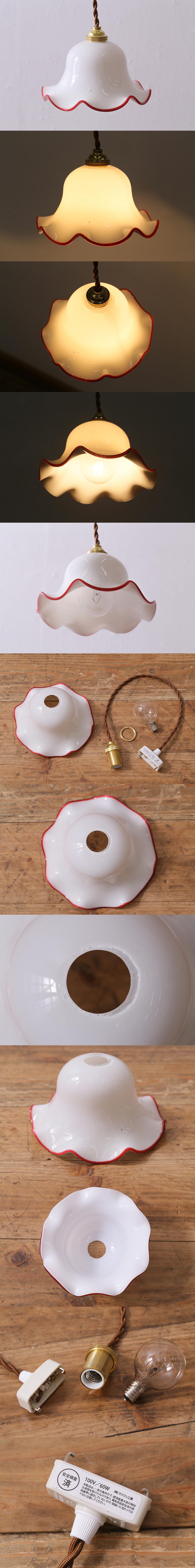 R-040808 ヴィンテージ照明 イギリスビンテージ 小振りな赤縁フリルのミルクガラスペンダントライト(ランプシェード、天井照明)