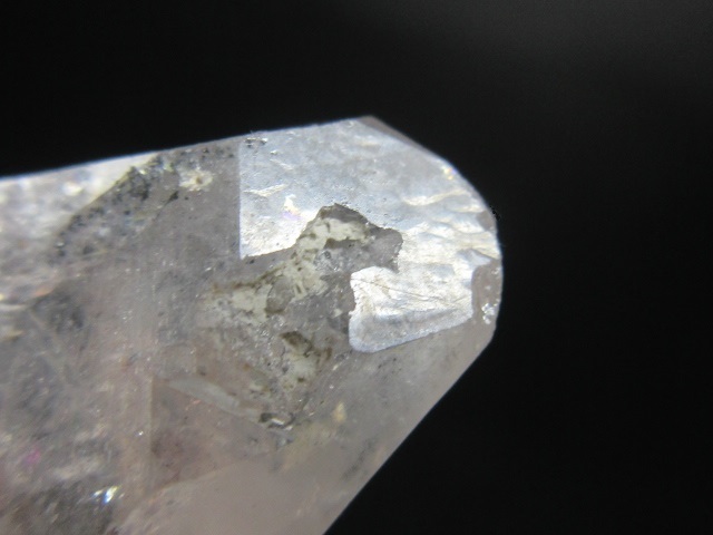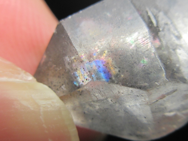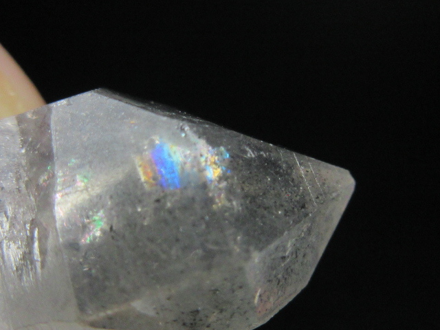 ・黒鉱物が表面近く、そして内部に散っていて、まるで雪が降っているように輝いて見えます。きれいなレインボーも見られる逸品です。