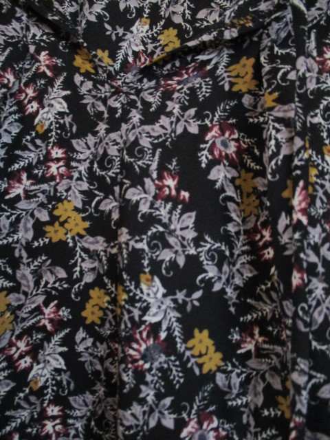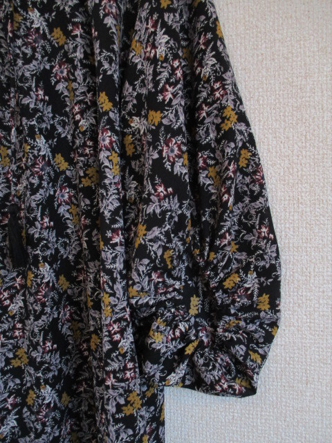 | 商品紹介 | 黒地に花柄がプリントされたワンピースです。 前より後ろ中央の丈が長くなっていて、両サイドは15cm程 スリットが入っています。 襟元はスキッパーで紐が付いています。(ひも先にはフリンジが付いています。) 日に当たると少し透け感がありますので、1枚に着る場合は インナーが必要です。 《素材》 ポリエステル100% |