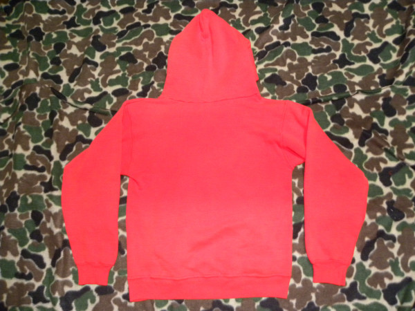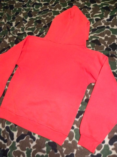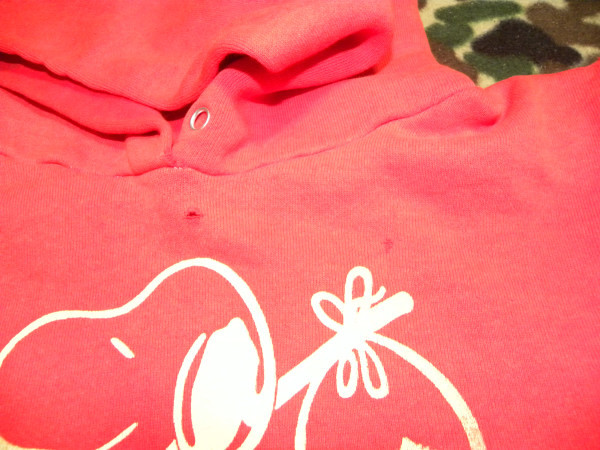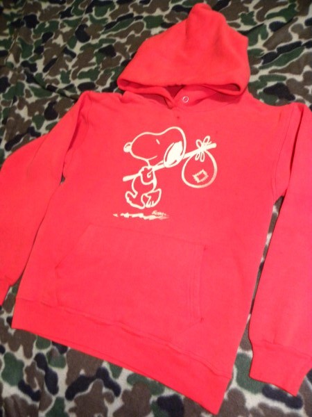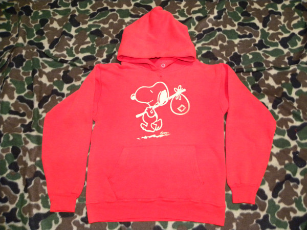 激レア!USA製・スヌーピー・ヴィンテージスエットパーカー赤・PEANUTSになります。 今では入手困難なUSA製のスヌーピー・ヴィンテージでオールド感のあるプリントや、 スエット素材がとってもいい雰囲気です。ヴィンテージショップから購入したもので、 USA製表記やタグ等はない状態ですが、USA製のヴィンテージということでコレクションとして購入したもので、 購入してから着用せず保管していたものになります。 サイズ表記もありませんので、実寸で肩幅45、身幅46、袖丈54、着丈52センチくらいになります。 平置き状態での計測になりますので多少の誤差はご了承願います。寸法的にSサイズくらいかと思いますので、 Sサイズの方に出品させていただきます。 状態はヴィンテージの中古の状態ですので、フロント首元、ポケットの付け根、袖リブ部分にほつれによる小穴が ある状態ですが、ヴィンテージスエットに慣れている方にはちょうどいいダメージ具合といった感じで、個人的には いい味が出ていると思いますので、これからもまだまだ着用して頂ける状態です。 普段、古着、ヴィンテージを着用する方には問題のない状態でも、普段、新品等を着用する方にはダメージは 大きく感じられる場合がございますので、古着、ヴィンテージに理解のある入札をよろしくお願いします。 探していた方、コレクションしている方など、ぜひこの機会にどうぞ!
