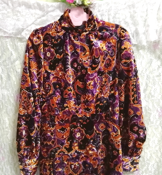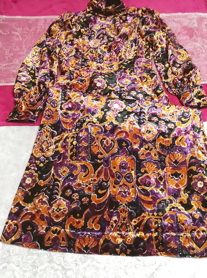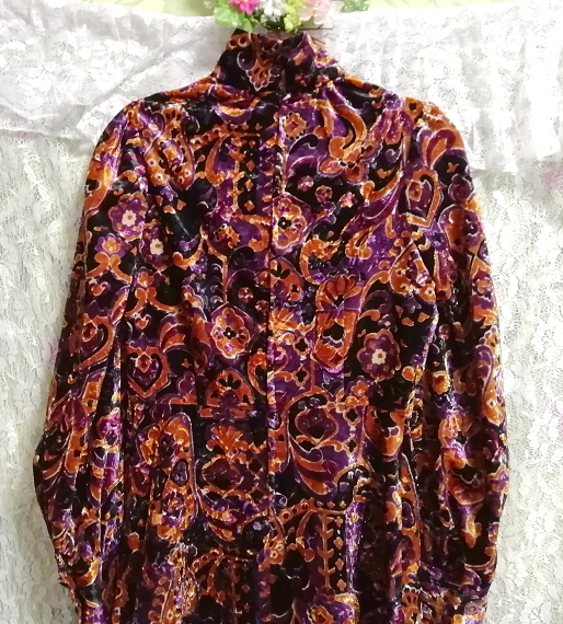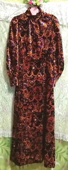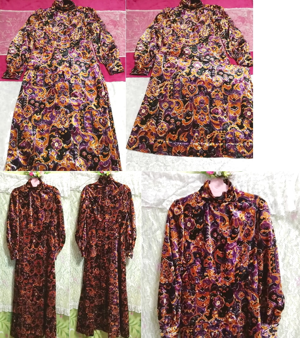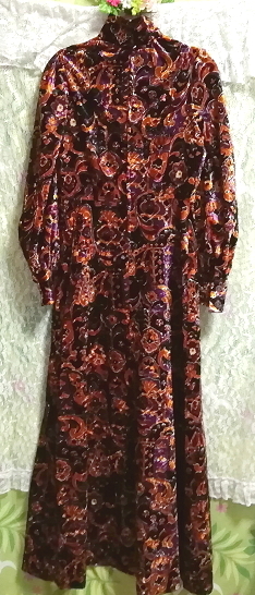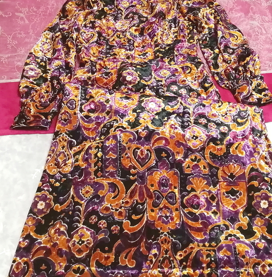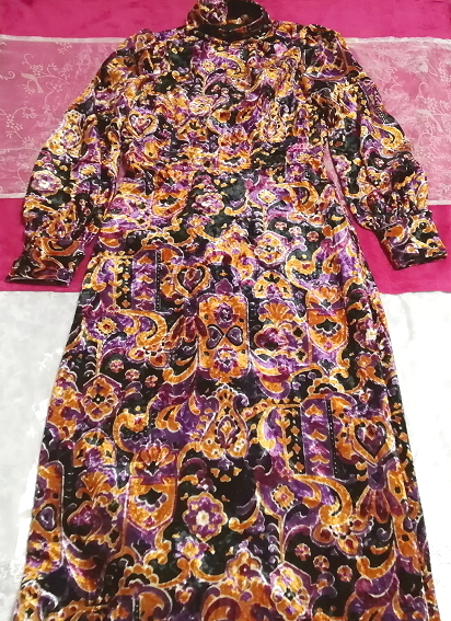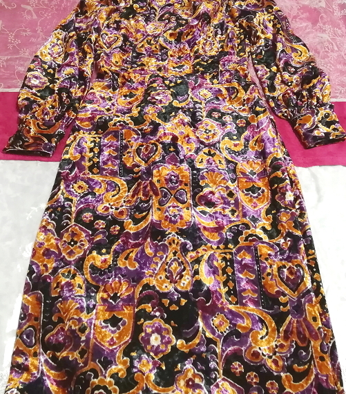 黒紫金ベロアエスニック柄ネグリジェロングマキシワンピース Black purple velour negligee ethnic pattern long maxi dress