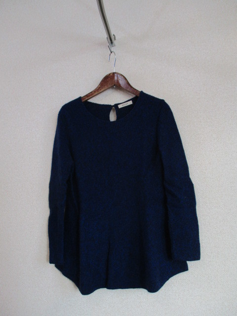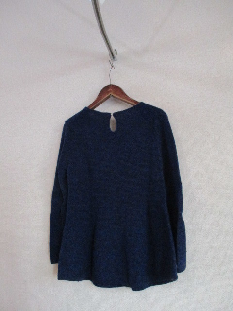 | 商品紹介 | 丸襟で襟の後ろに脱着用ボタンが付いた長袖ニットです。 ウエストは少し細くなっていて、裾に向かって若干Aラインになった形です。 色はパッと見、ネイビーですがよく見ると明るいネイビーと黒い糸が混ざっています。 《素材》 ウール85% アンゴラ15% |