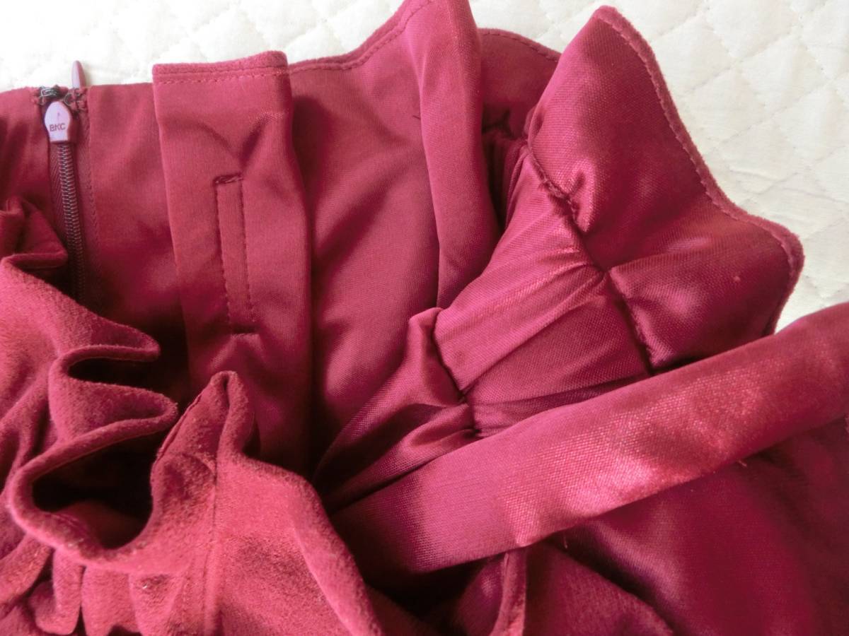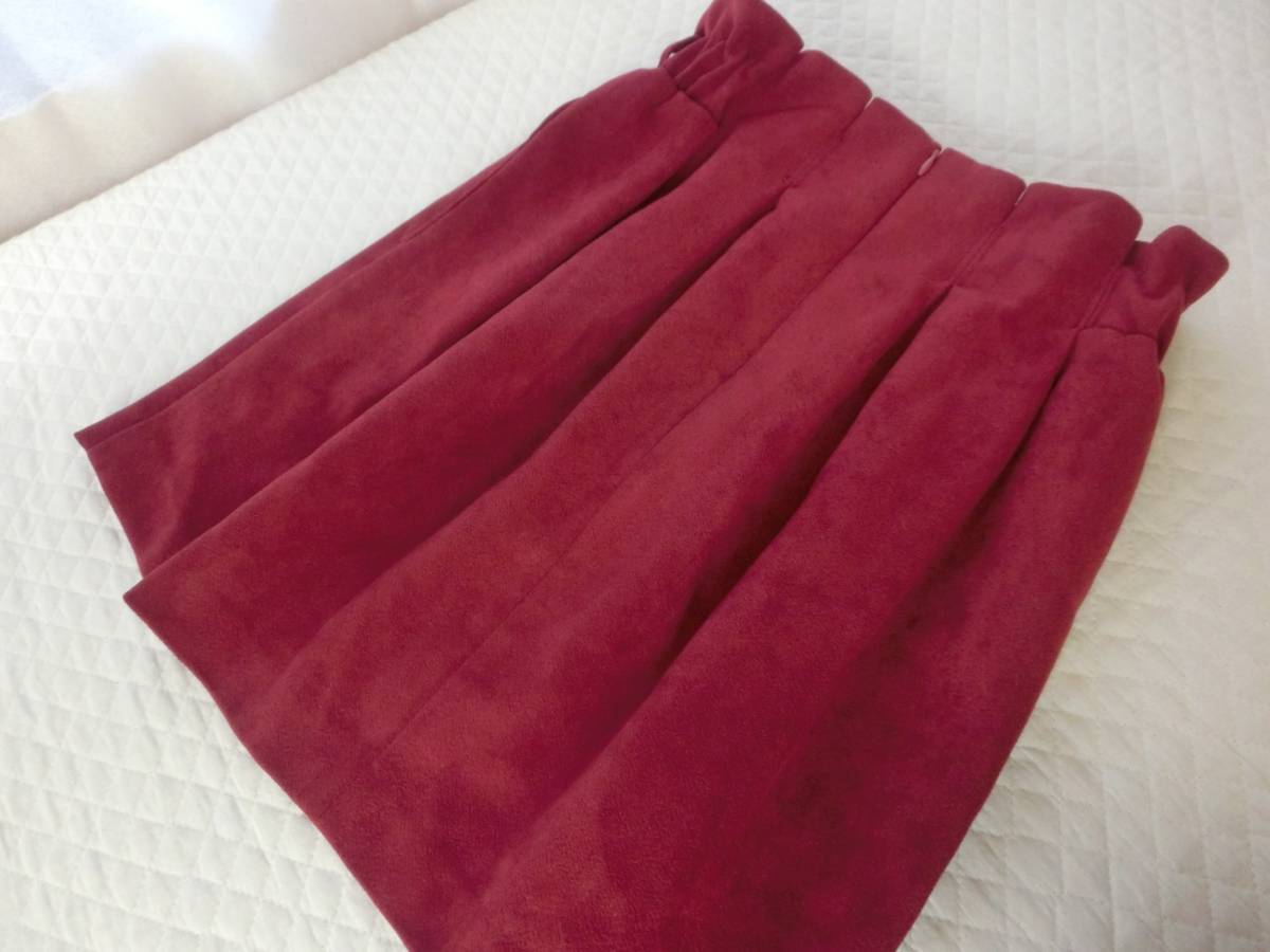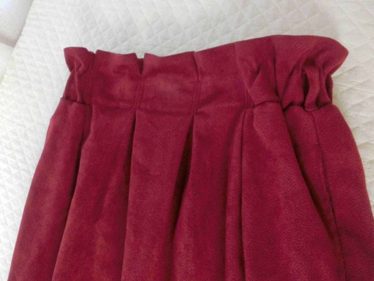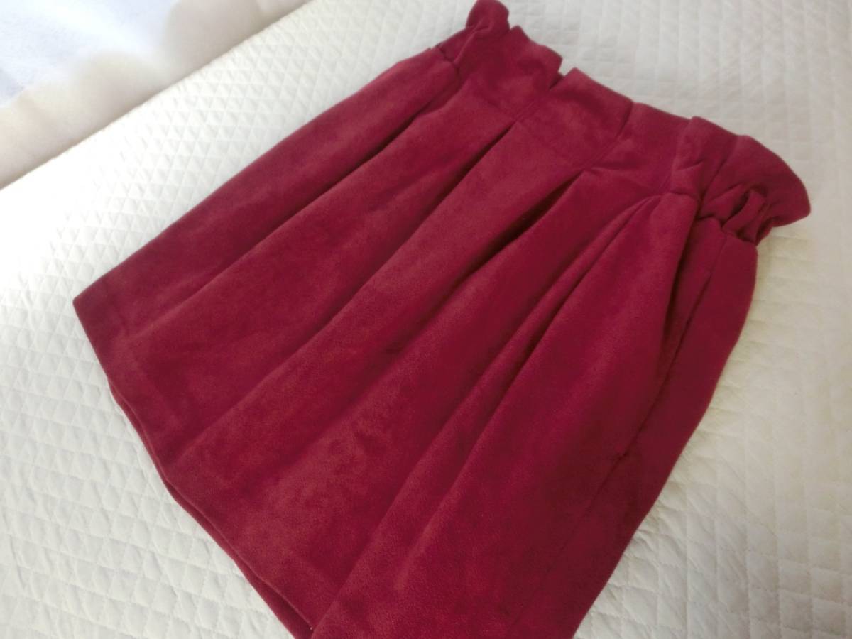 ★ヘザーのスカートです♪ ・柔らかい厚手でさわり心地の良いピーチスキン生地の ボルドー×ウエストはゴムで、フリルのような カットがとてもかわいいです☆ ・リブニットなどをインして着るとステキです♪ ★サイズ ・ウエスト幅 33cm~ゴムで伸びます。 ・ヒップ幅 58cm ・裾幅 51cm ・丈 45cm位 |