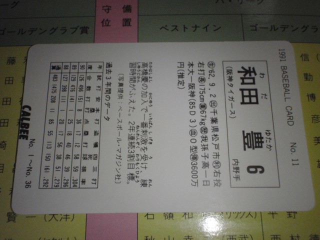 1991 カルビーベースボールカード No11 和田豊 阪神タイガース