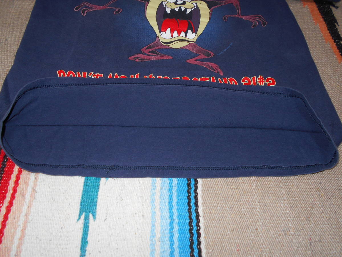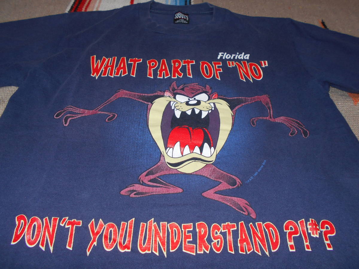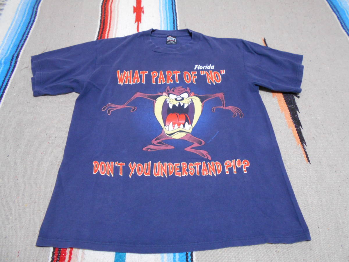 1990Sビンテージ、フロントのインパクト有る TAZ TASMANIAN DEVIL グラフィックデザイン、WHAT PART OF NO DON'T YOU UNDERSTAND レタリングの入り方が極めて良い感じ