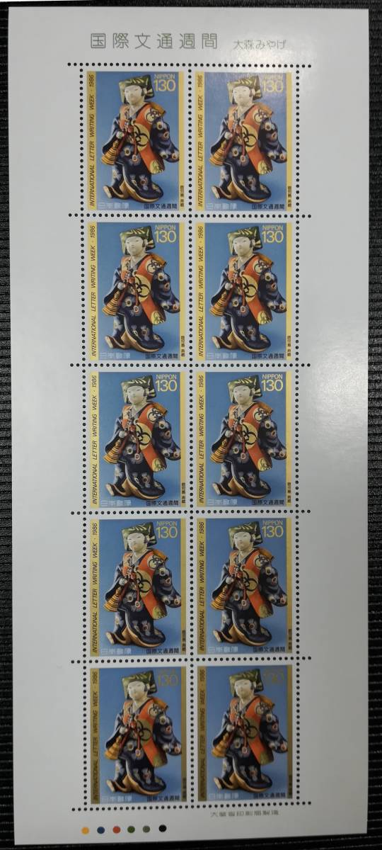 【 国際文通週間 1986年 大森みやげ 1シート 130円×10枚 】です。