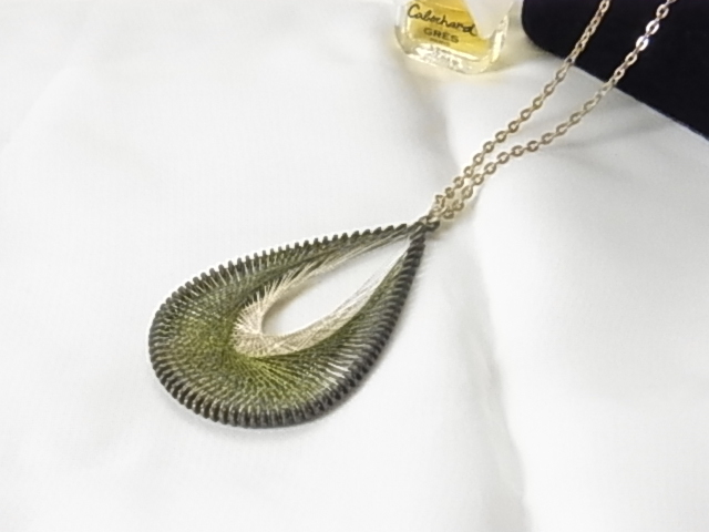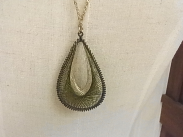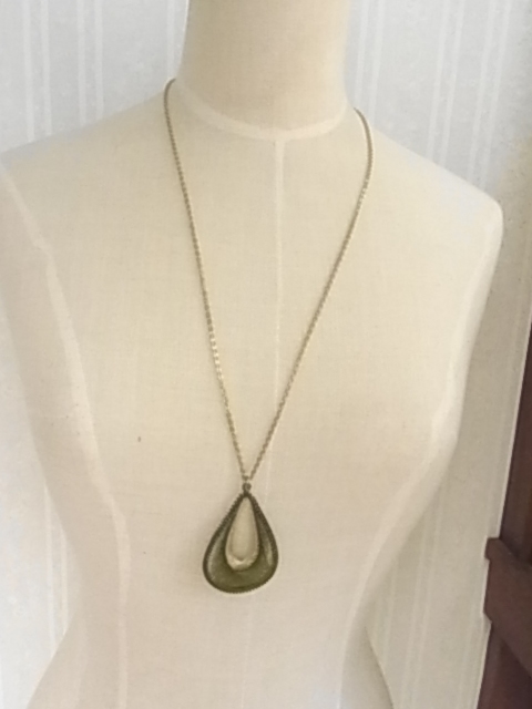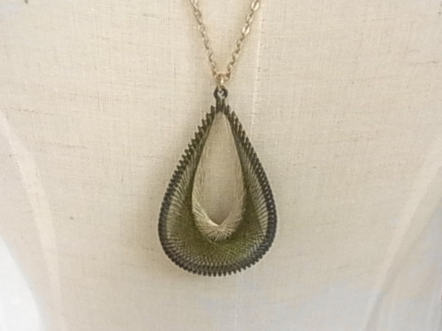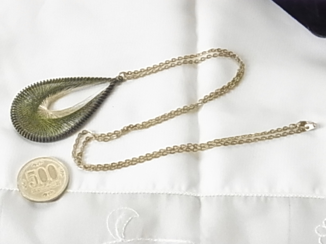 カーキグリーン 深緑にベージュ系カラー 美しい糸の装飾デザイン 涙型 ディアドロップ型 ロングネックレス●●
