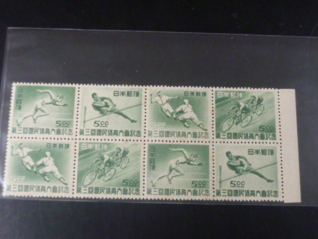19 S 日本切手 1948年 記135-8H 第3回国体 5円 8枚ブロック 未使用NH