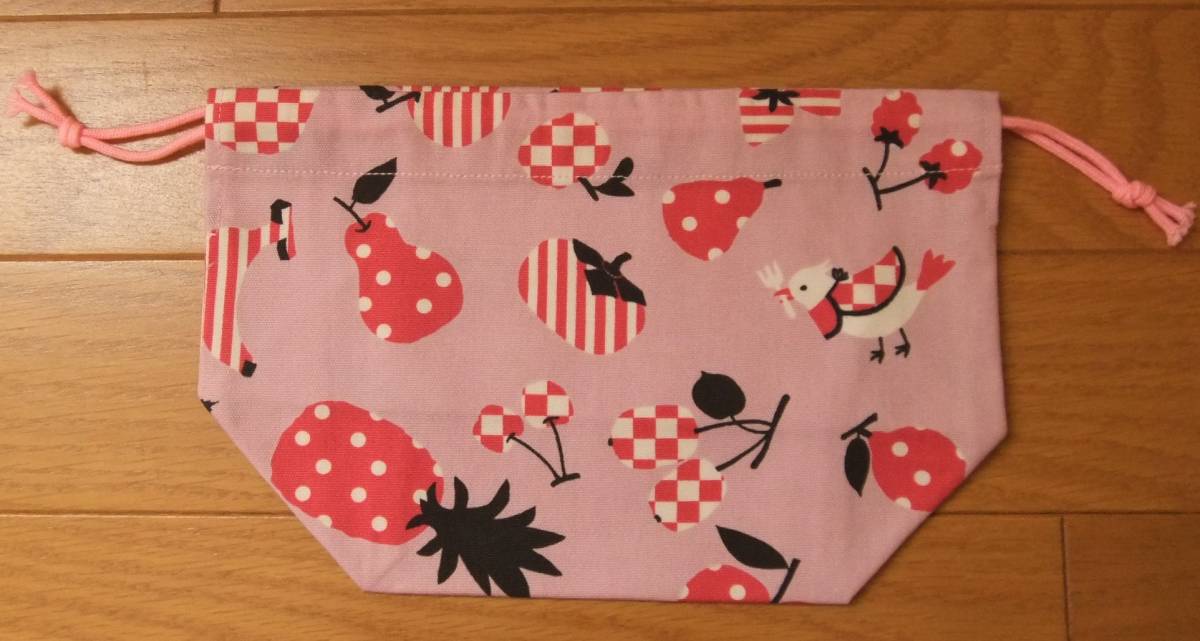 YUWAのcotorienneのフォークをくわえた鳥・りんご・バナナ・洋ナシ・さくらんぼなどのフルーツパラダイス生地で、コップ袋とお弁当袋とランチョンマットを作りました。