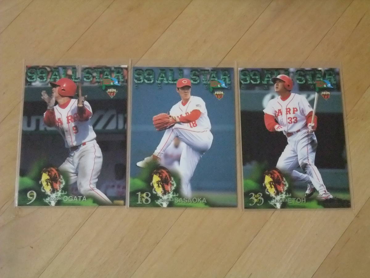 BBM99オールスターカードA23佐々岡真司、A30江藤智、A33緒方孝市の広島チームコンプリートセット全3枚です。