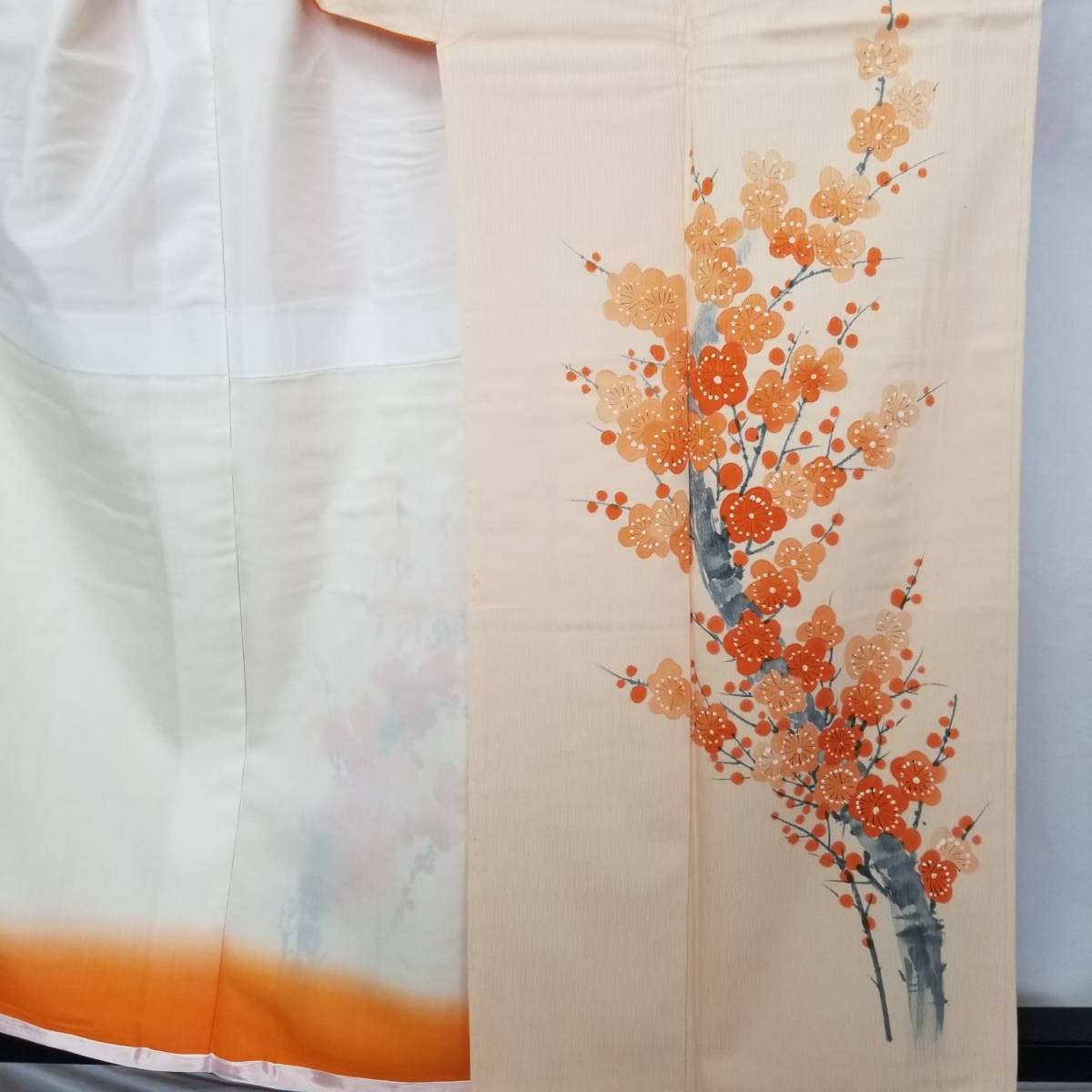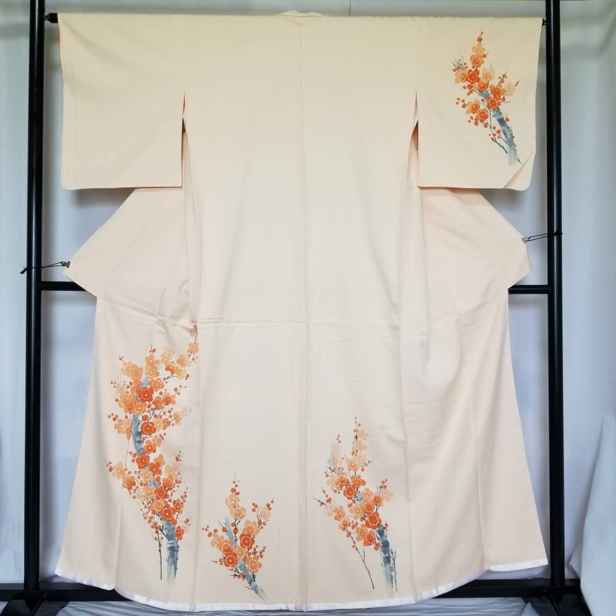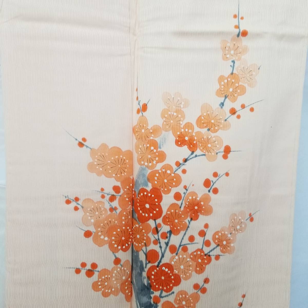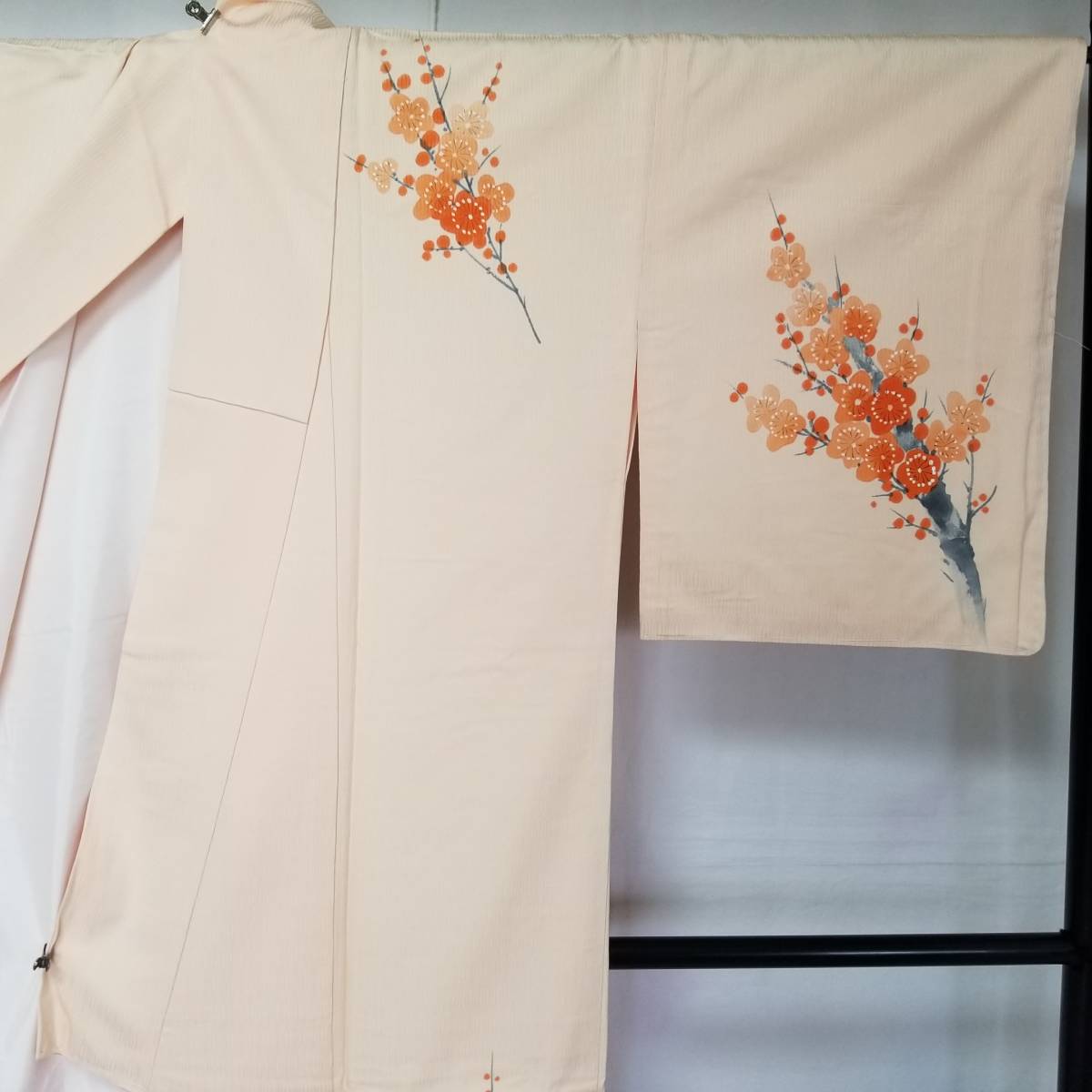 {特値品} 手縫い袷仕立品 *未使用品 *仕付け糸付き *美品 ☆紋ナシ (生地) ●正絹 丹後 紋意匠縮緬地 {重目地}*光沢のある生地です ●幾何学.地紋 ●着物重さ 約 970g (地色) ●肌色地{薄い黄赤色} ●綺麗なお色です (模様) ●手描き染*手暈し染で.{朱色}{杏色}の花満開の梅の木を緻密に描いており ます ●木のお色は.ごく暗い紫みの青色です ●見事な暈し染です (胴裏地) ●ポリエステル100%.高級地{純白色}**美品 (八掛地) ●正絹 両駒織 紬地{柿色*暈し染}**美品 ◎消費税は.お預かりしておりません◎ (寸法) 身丈 (肩から裾まで) 約161cm 裄丈 約65cm {袖付縫い代 袖側約2cm 身側約1cm} 袖丈 約49cm 袖幅 約33cm 前幅 約23cm 後幅 約31cm *広衿 | |||