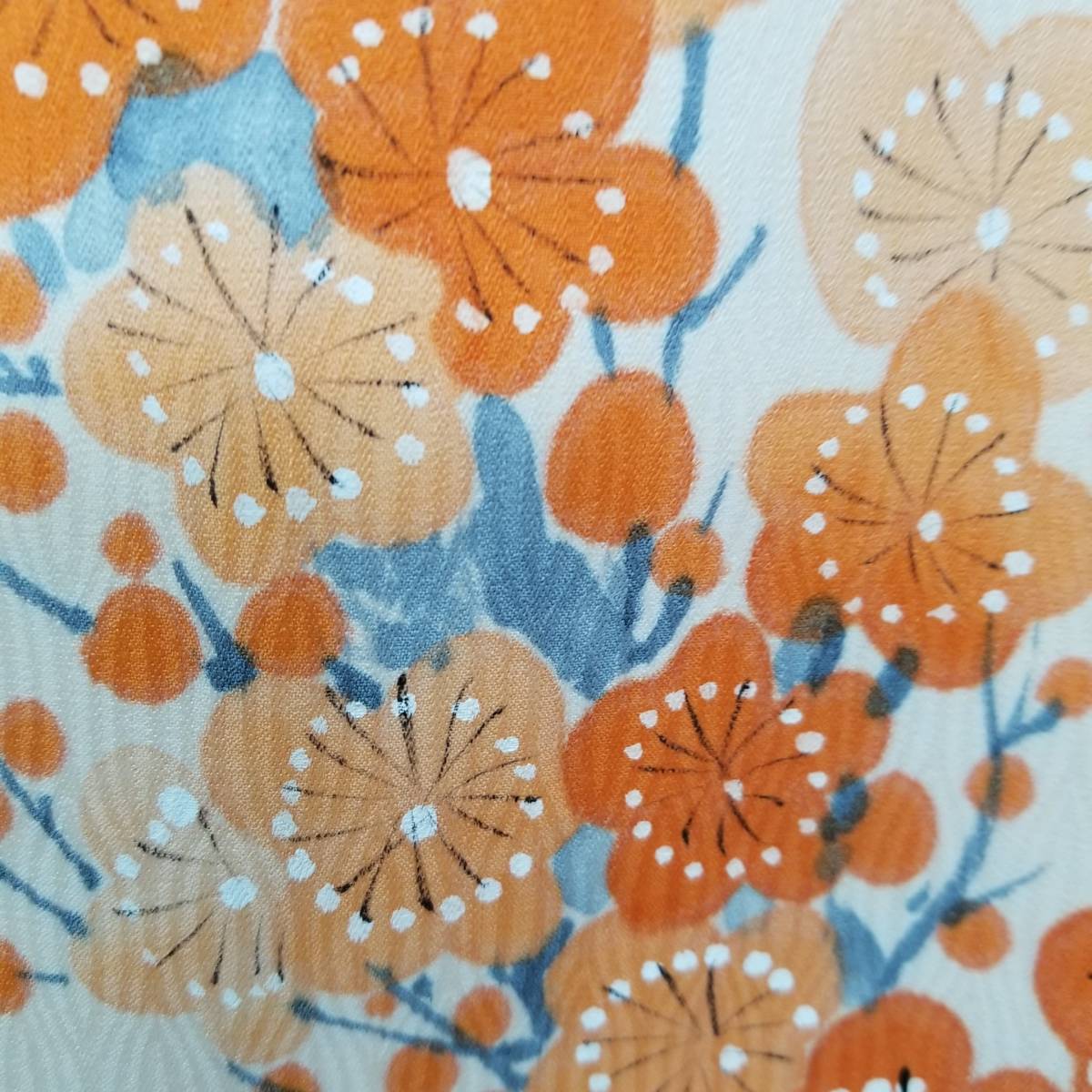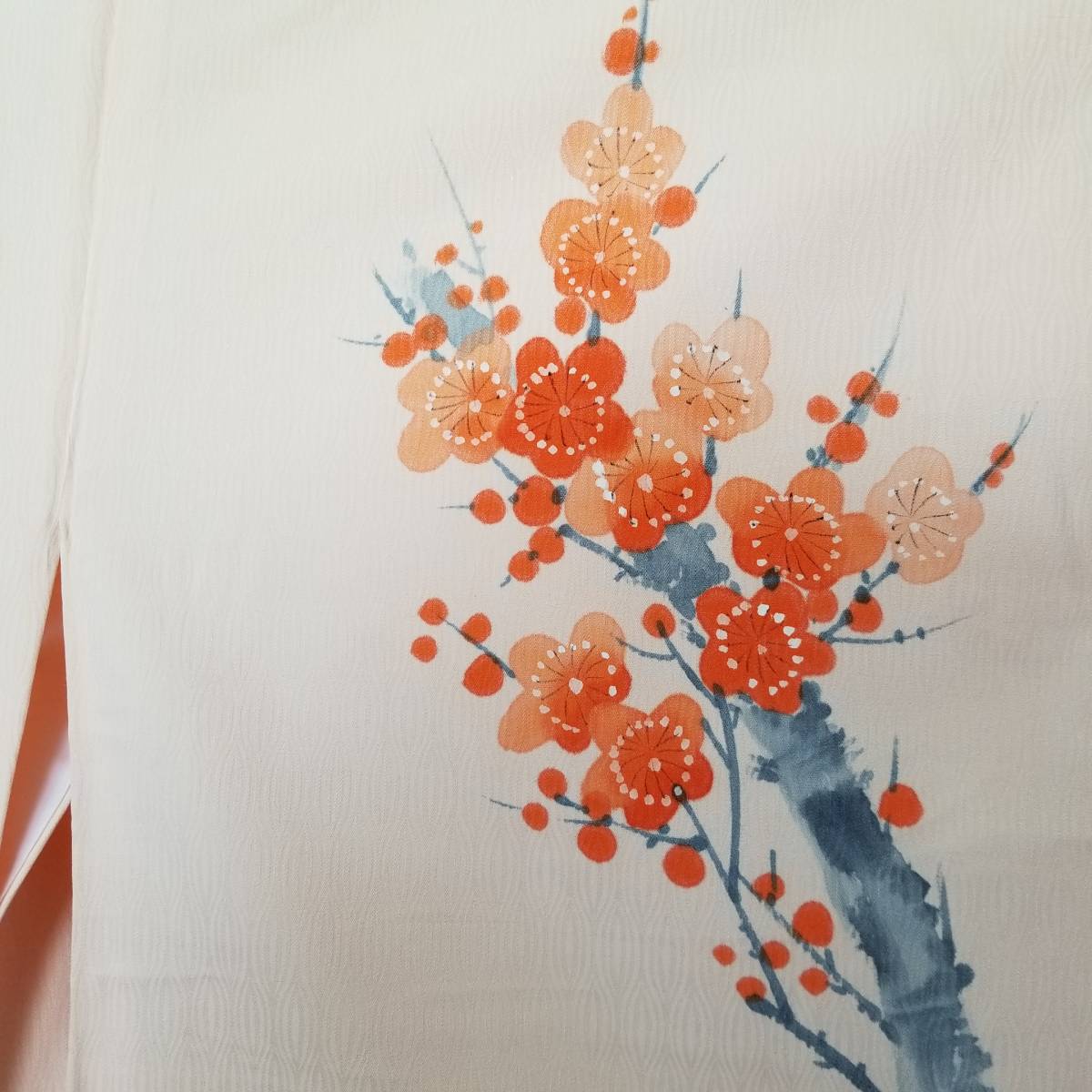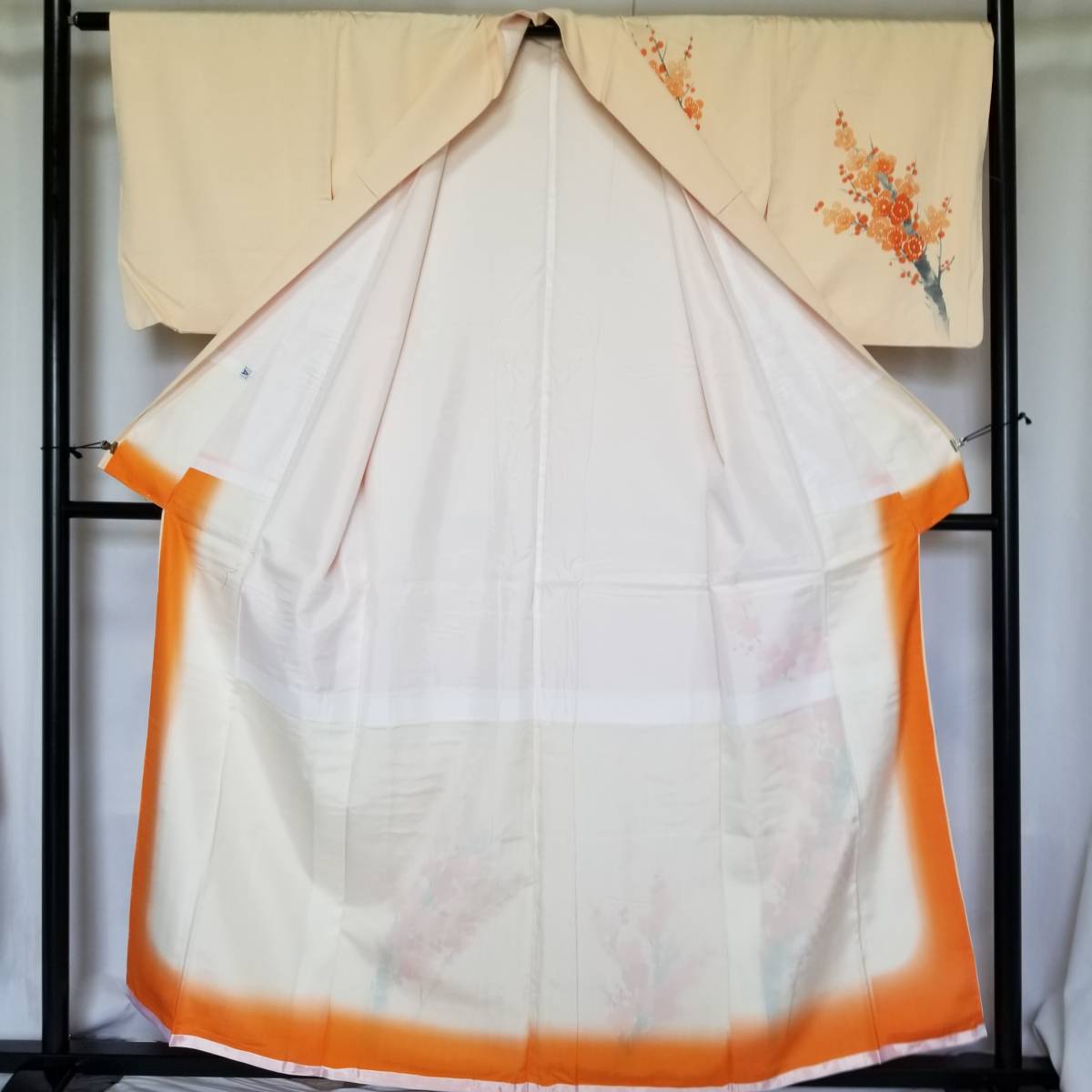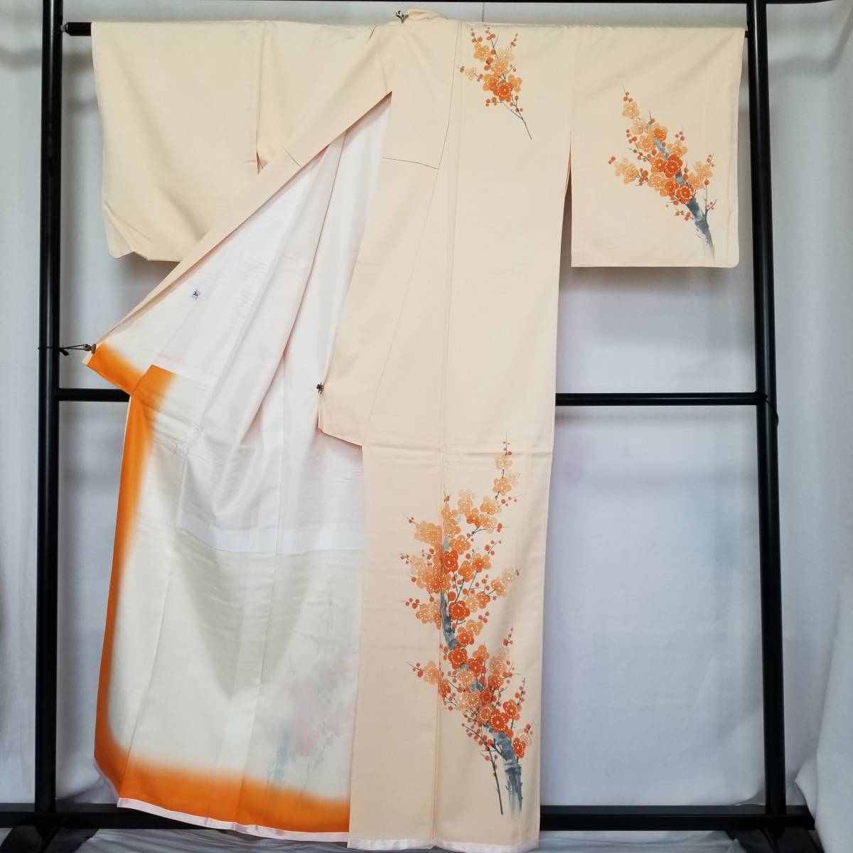 {特値品} 手縫い袷仕立品 *未使用品 *仕付け糸付き *美品 ☆紋ナシ (生地) ●正絹 丹後 紋意匠縮緬地 {重目地}*光沢のある生地です ●幾何学.地紋 ●着物重さ 約 970g (地色) ●肌色地{薄い黄赤色} ●綺麗なお色です (模様) ●手描き染*手暈し染で.{朱色}{杏色}の花満開の梅の木を緻密に描いており ます ●木のお色は.ごく暗い紫みの青色です ●見事な暈し染です (胴裏地) ●ポリエステル100%.高級地{純白色}**美品 (八掛地) ●正絹 両駒織 紬地{柿色*暈し染}**美品 ◎消費税は.お預かりしておりません◎ (寸法) 身丈 (肩から裾まで) 約161cm 裄丈 約65cm {袖付縫い代 袖側約2cm 身側約1cm} 袖丈 約49cm 袖幅 約33cm 前幅 約23cm 後幅 約31cm *広衿 | |||