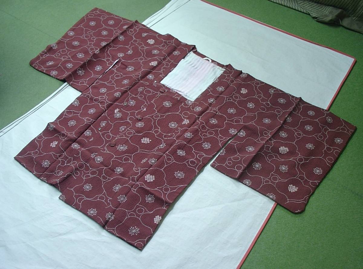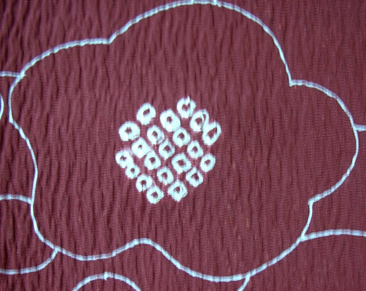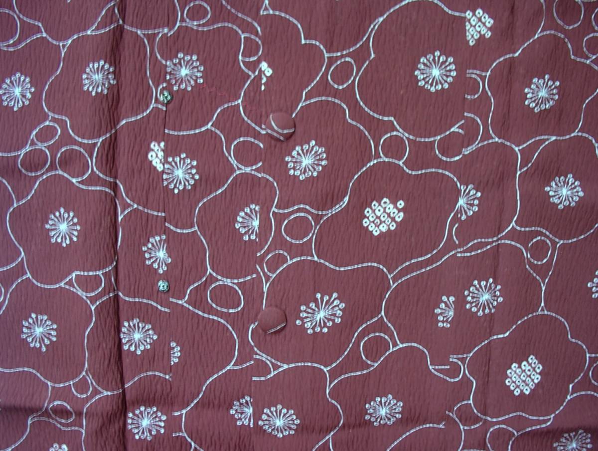 | □ | 正絹。 濃い浅蘇芳色の縮緬地に梅花模様が表されています。 絞りも使われています。 目立った汚れはございません。 神経質なお客様は入札をお控えください。 |