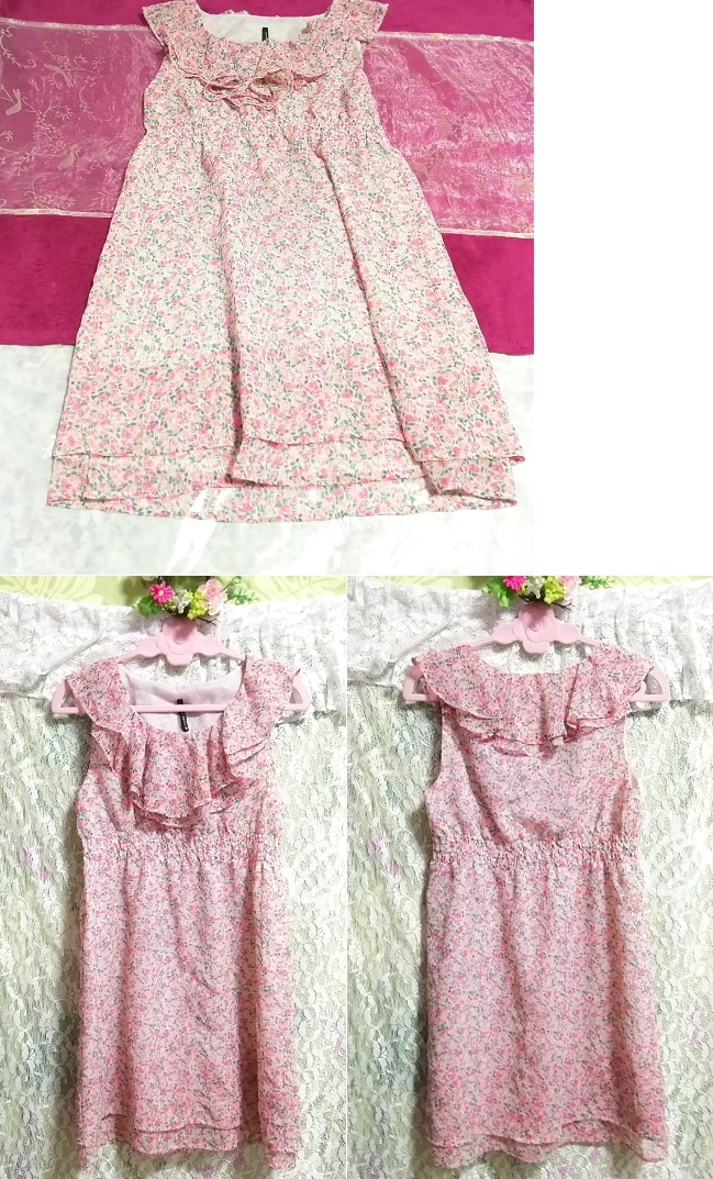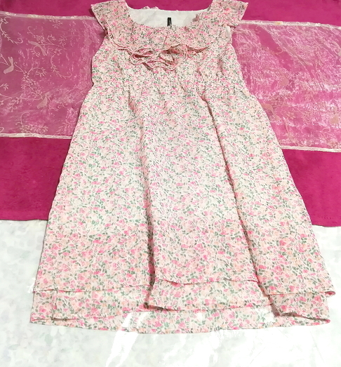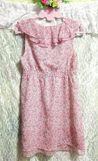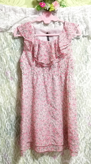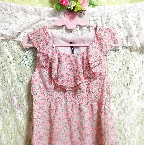 ピンク花柄フリルシフォンネグリジェノースリーブチュニックワンピース Pink floral frill chiffon negligee sleeveless tunic dress