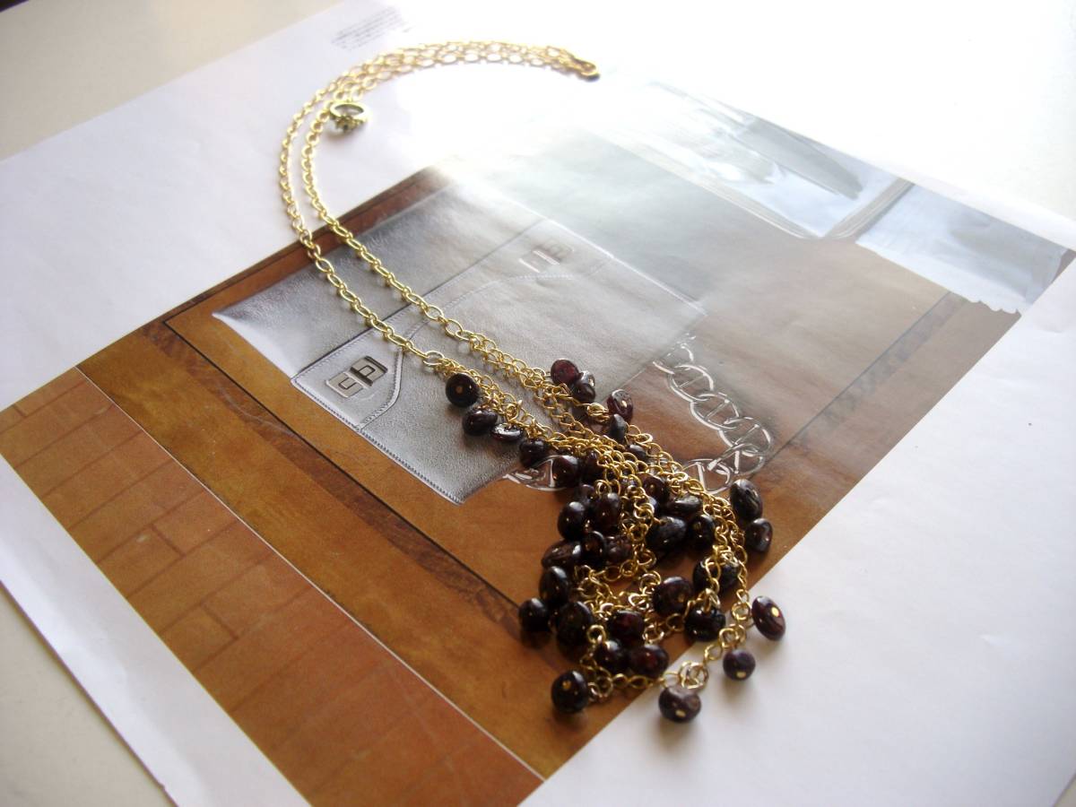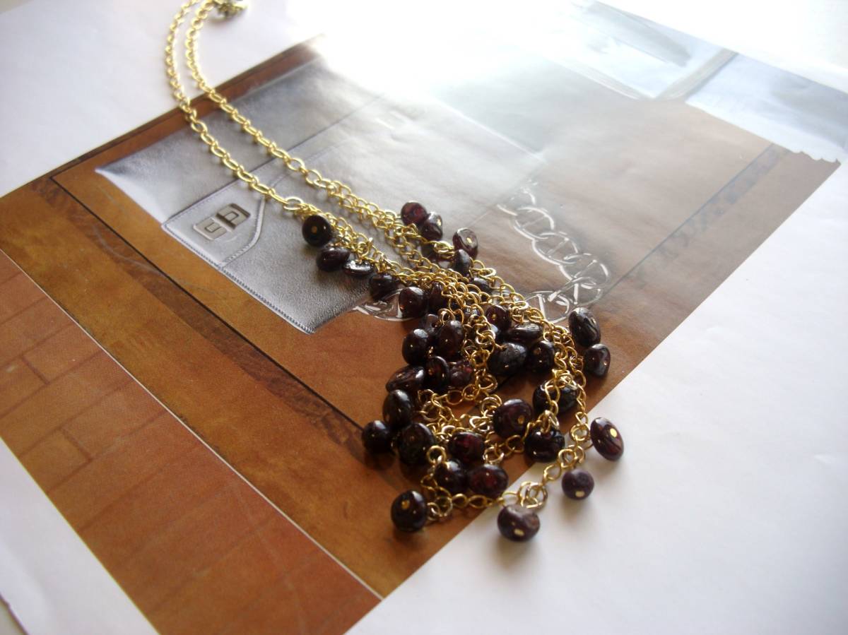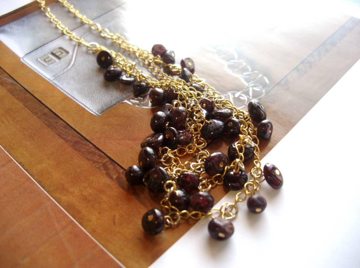 シックな色合わせ・・シリーズです♪深い赤のガーネット・・小さなタンブルのガーネットを集めて2連のネックレスです♪4ミリから7ミリ位までのタンブルのガーネットを2連のデザインチェーンに繋いで可憐な表情です♪長さは全長75センチ位で調節自由です♪お 揃いのブレスレットやピアスも出品しています♪♪シンプルで飽きのこないいつまでも着けられるデザインを考えて作りました♪ハンドメイドをご理解頂い てノークレーム、ノーリターンでお願いします