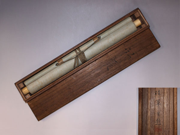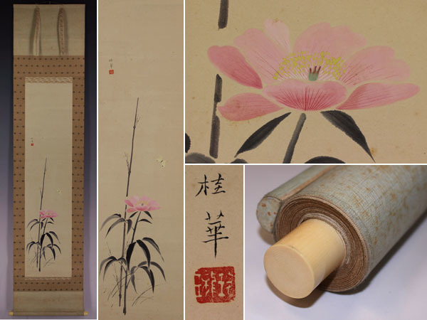 金島桂華 かなしま-けいか (1892-1974) 大正-昭和時代の日本画家。明治25年6月29日生まれ。 西家桂州,平井直水に師事,のち竹内栖鳳に入門。大正14年「芥子」が帝展で特選。昭和12年京都市美術工芸学校教諭となり,画塾衣笠会を主宰する。29年「冬田」で芸術院賞。芸術院会員。昭和49年9月16日死去。82歳。広島県出身。本名は政太。 本紙、表装共に、染み、点染み、.汚れ、ヤケ、皺があります。 【サイズ】 作品 横約29cm×縦約121cm 表装 横約44cm×縦約193cm |