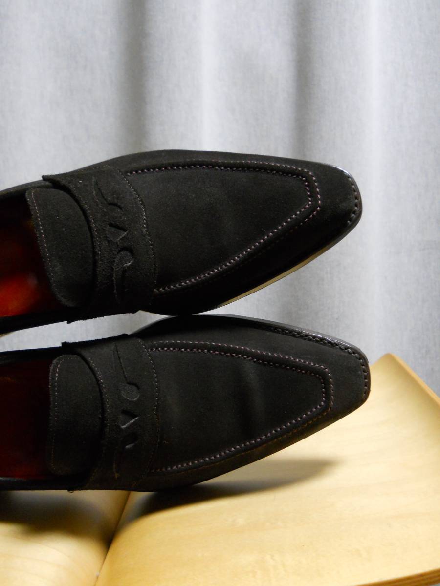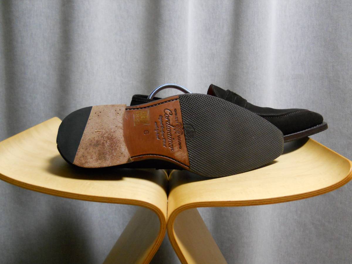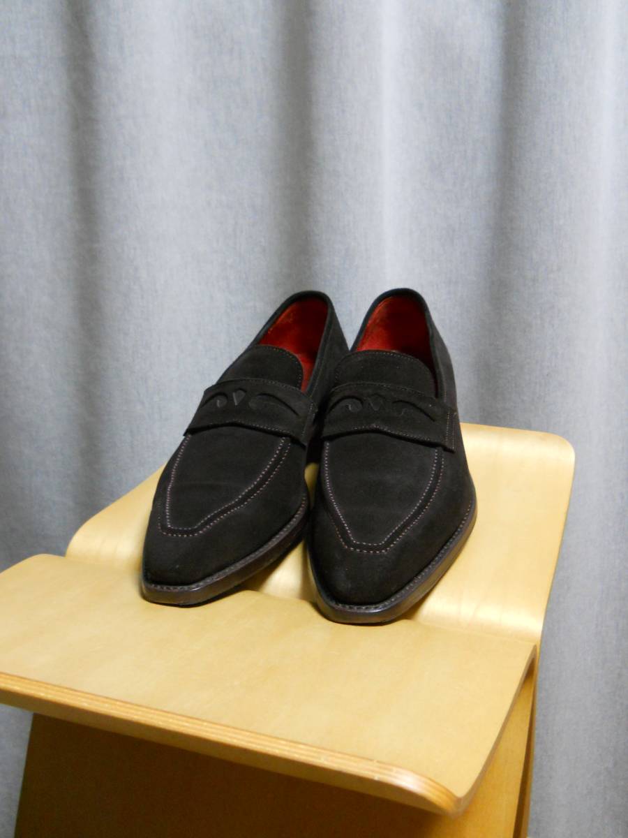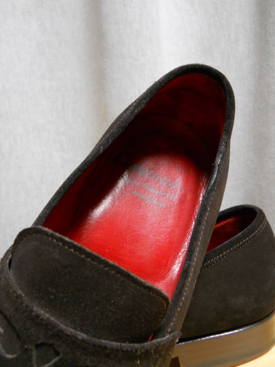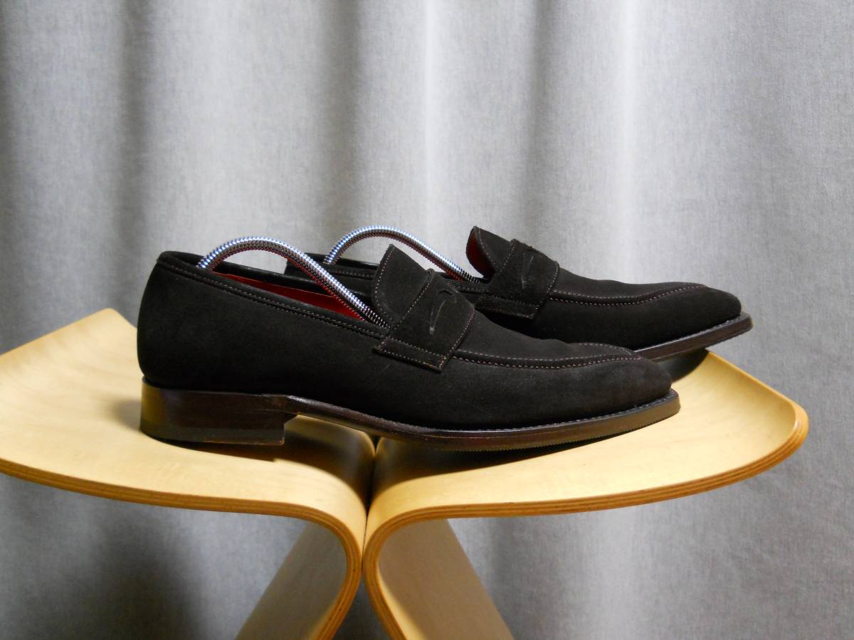 ダークブラウンスウェード、レザーソール、グッドイヤーウェルトによる底付け。
