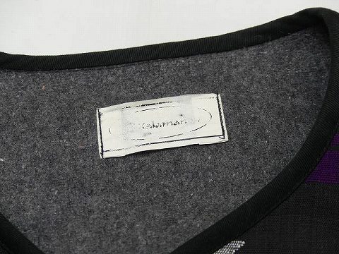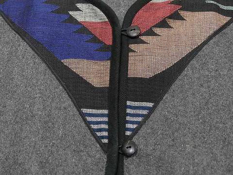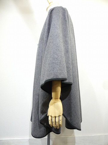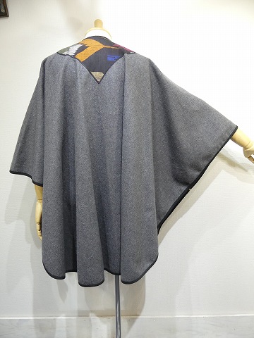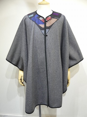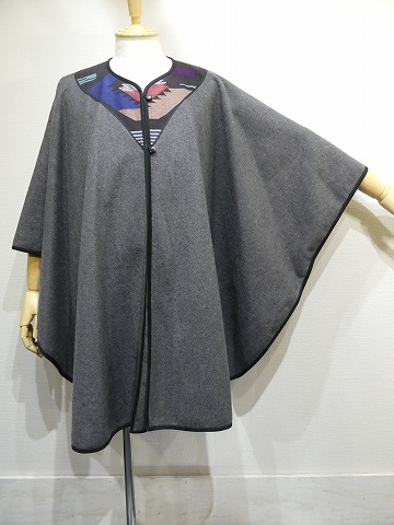 こちらは、80年代頃のカラマン ウール デザイン ケープ コート (ポンチョ)になります。グレーベースのウール地に襟元にはフォークロアな刺繍が入るデザイン コートになります。袖部分には留まりボタンもありますので、着用すると綺麗なシルエットになります。サイズ感シルエット共に良く、男女共に着用できるユニセックスなデザインになっています。実際着用すると本当にカッコイイです。