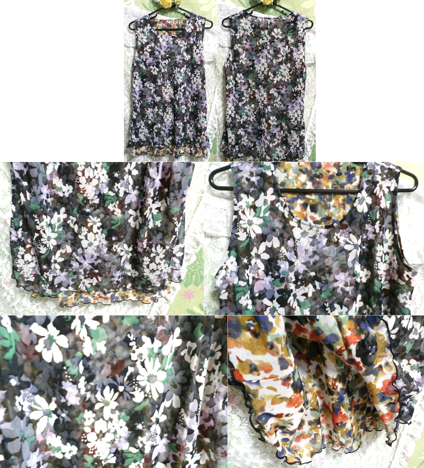 ノースリーブ黒花柄2段フリル/チュニック/ワンピース Sleeveless black floral pattern 2 ruffle/tunic/onepiece