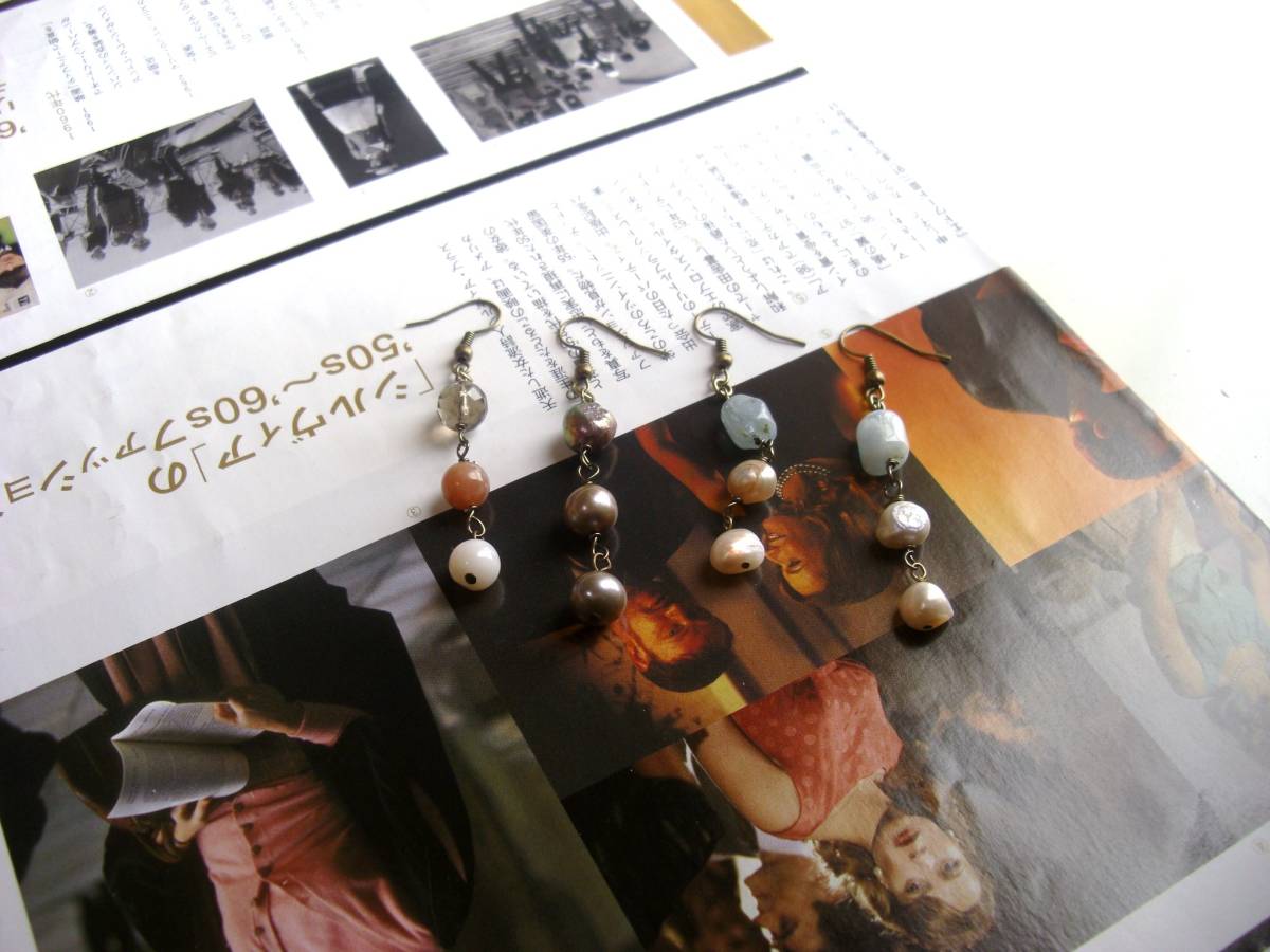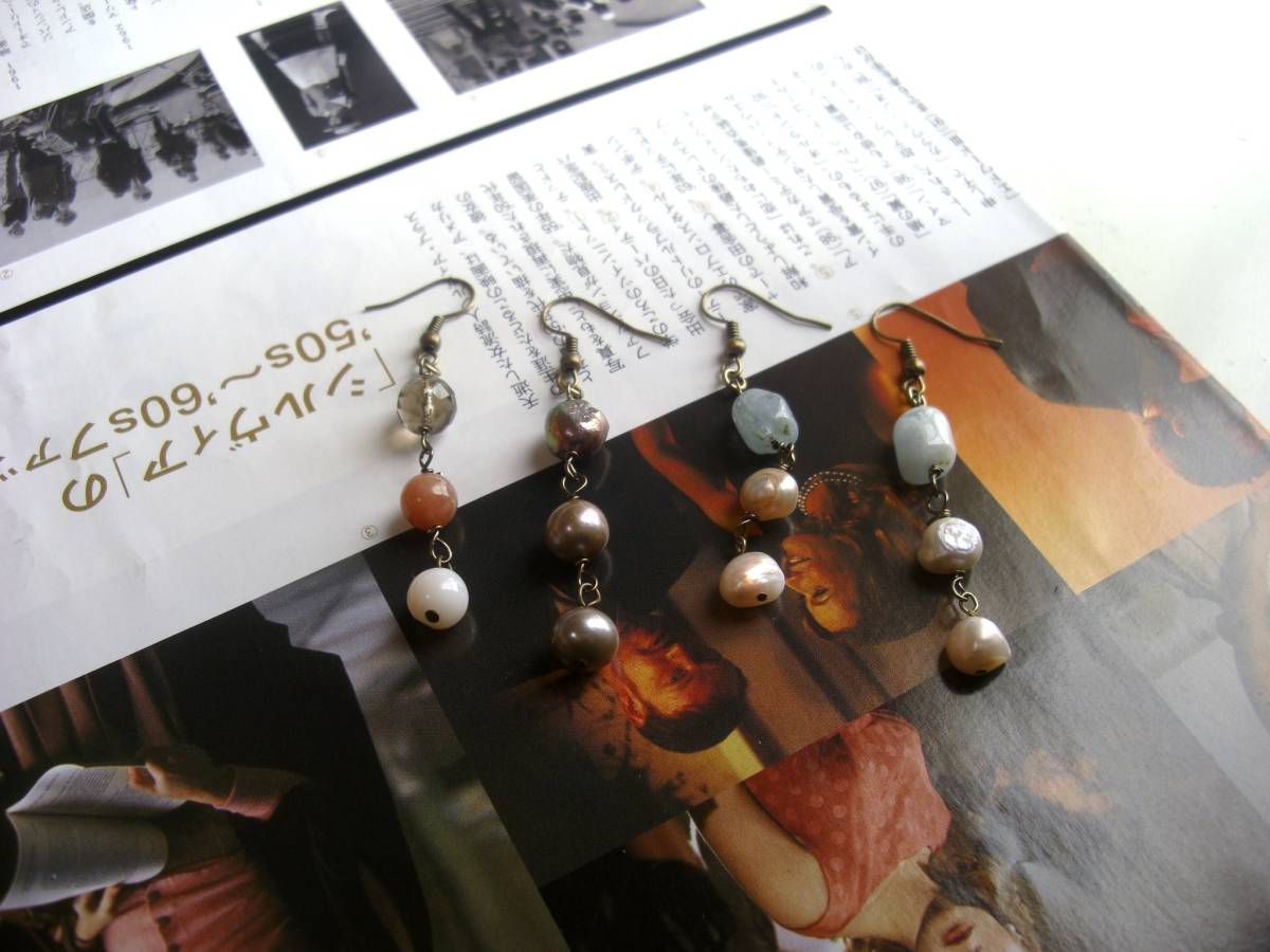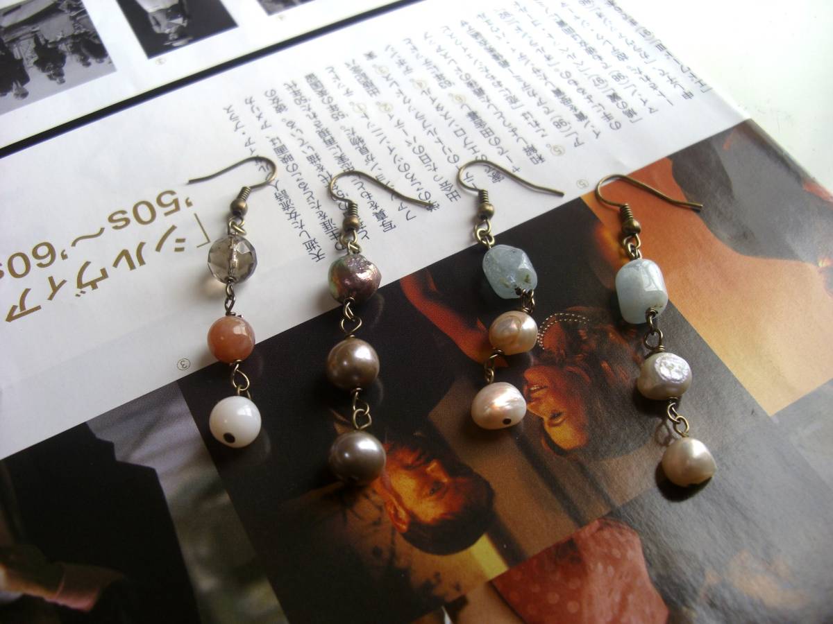 心を躍らせるもの・・シリーズです♪春色コレクション・・やさしいパステルカラーの石を集めたピアス4点セットです♪それぞれデザイン違いなので色々に組み合わせて楽しんでいただけます♪甘いピンク色のローズクォーツやピンクオ パール、グレーがかった水色のアクアマリンやグレーパールやピンクパール、スモーキークォーツを合わせました♪6ミリから10ミリ位までの丸玉やボタン、ラフタンブルなどデザイン違いです♪長さは4点とも6・5センチ位です♪イヤリングにも変更出来ます♪パ リ(??)っぽいアンティークな雰囲気で作りました。お揃いのネックレスやブレスレットも出品しています♪シンプルで飽きのこないいつまでも着けられるデザイ ンを考え て作りました!ハンドメイドをご理解頂いて ノークレーム、ノーリターンでお願いします