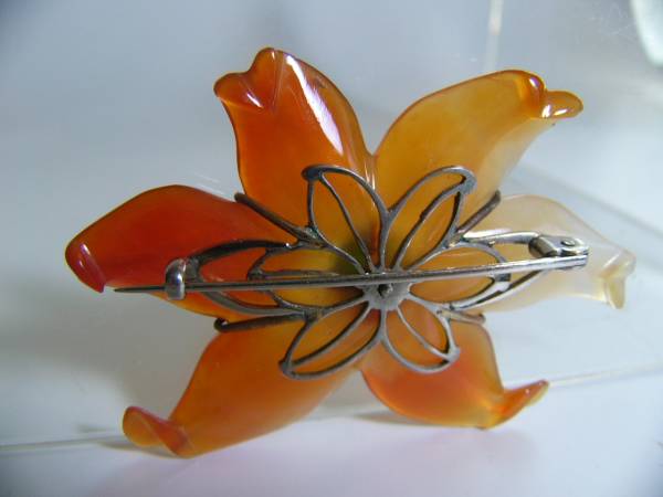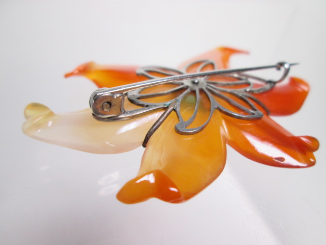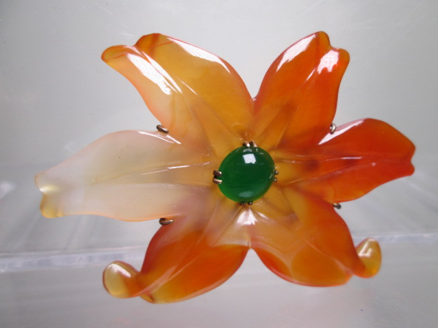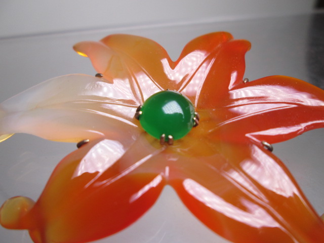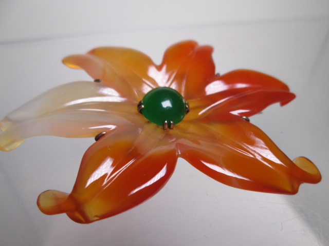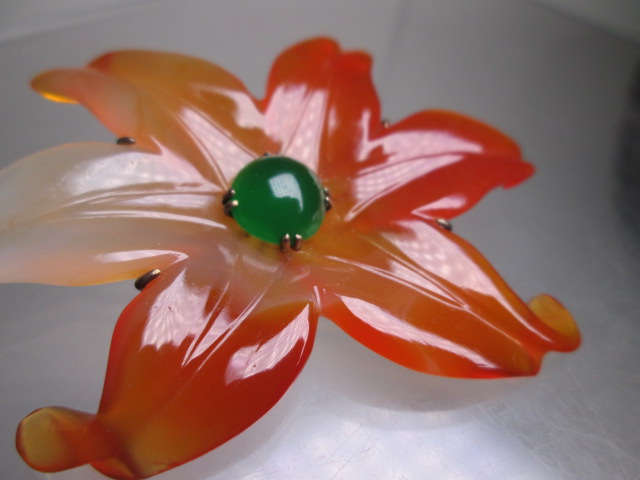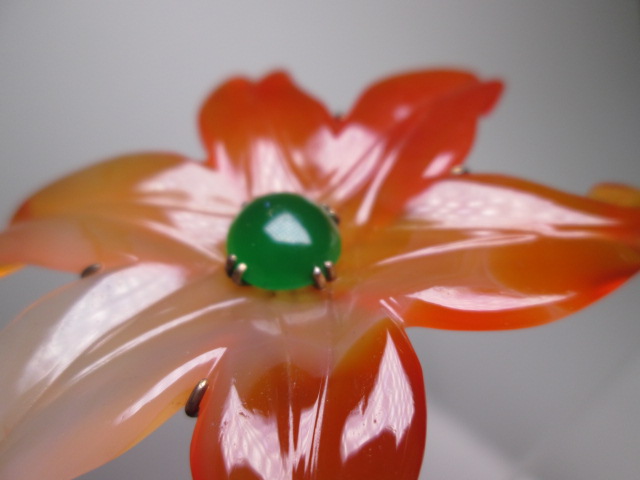【江月】アンティーク・本瑪瑙に緑石飾り 花の美しいブローチ 12,79g