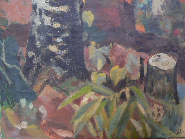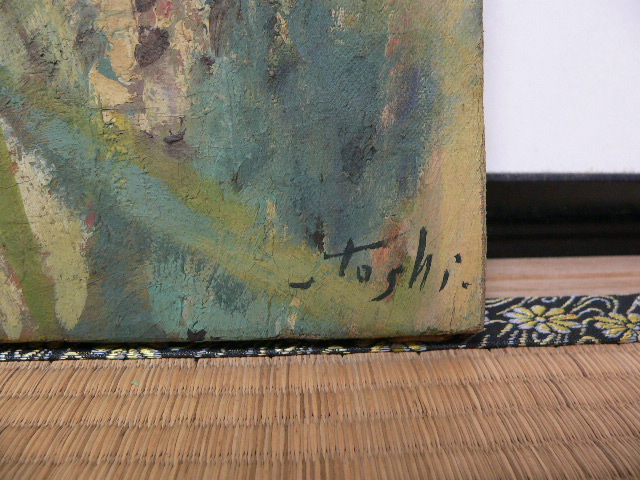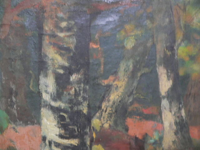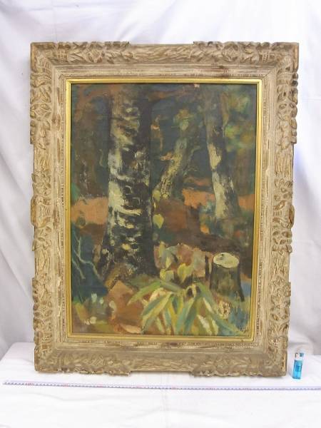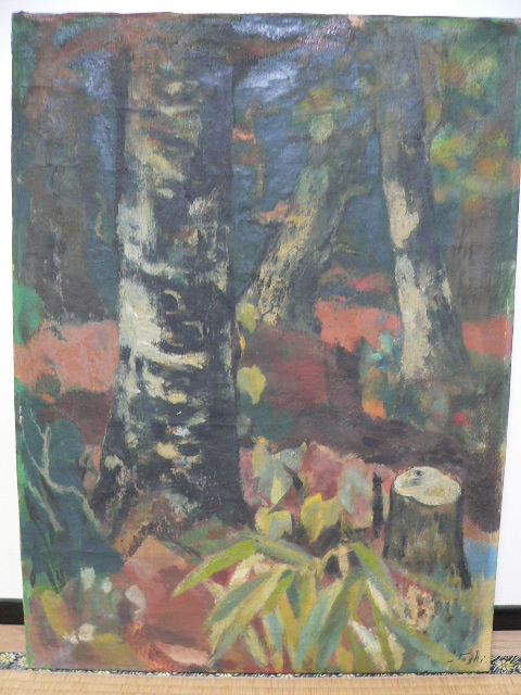 梶谷寿雄(1924-1986年) 「樹々」 油彩 絵画 飾物 額装です。昭和29年作。キャンバス裏に画題・年記・画家名などの記述のシールらしきものが貼られてます。真筆保証品。