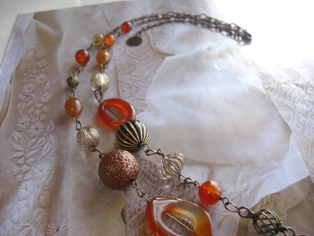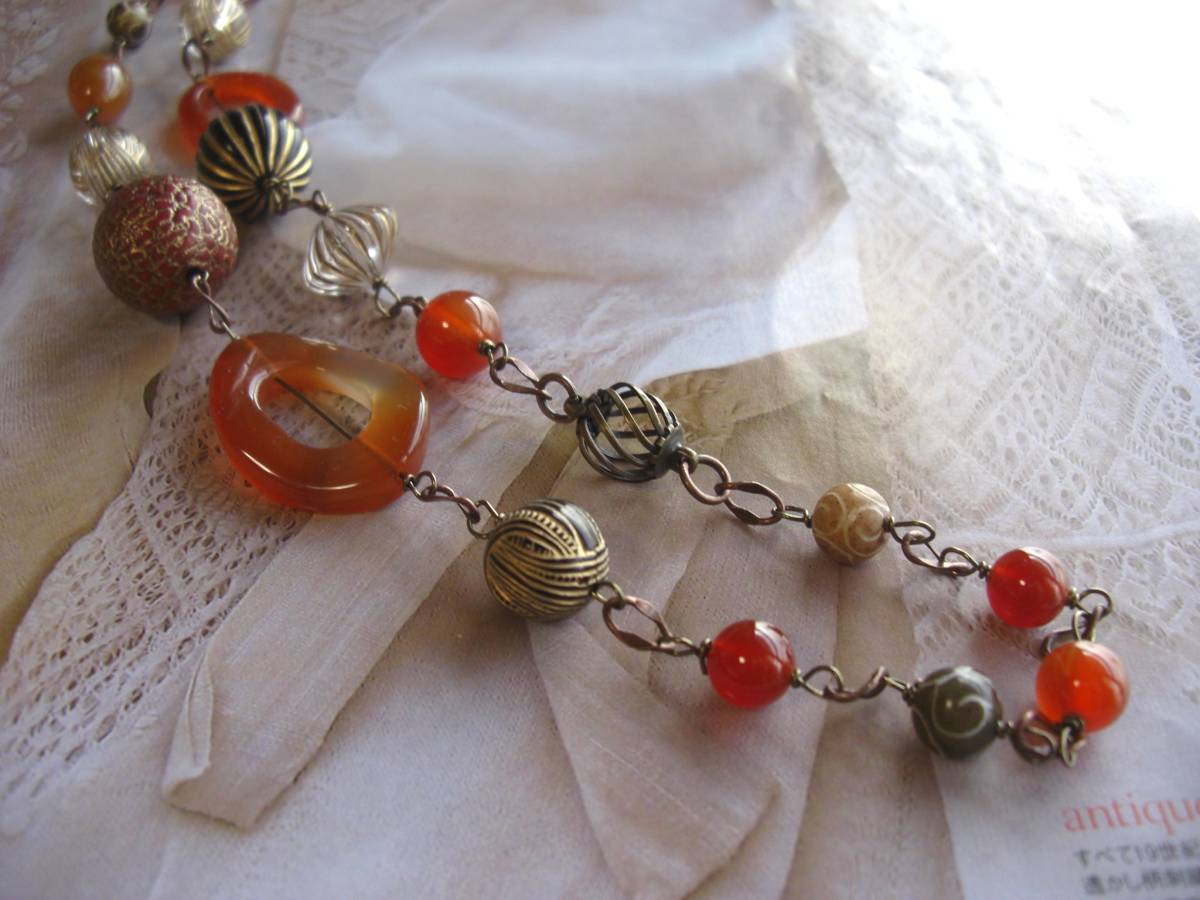 シックな秋色を繋げて・・シリーズです♪オリエンタル仕様・・秋色のカーネリアンのネックレスです♪アンティークビーズや透かしのメタ ルチャーム を合わせてアンティーク・モダンしています♪カーネリアンは8ミリから25ミリ位までの丸玉やナツメ、オーバルリングです♪長さは全長95センチ位で調節 自由です♪お揃いのネックレスや ブレスレットやピアスも出品しています♪シンプルで飽きのこないいつま でも着けられるデザインを考えて作りました♪ハンドメイドをご理解頂いてノークレーム、ノーリターンでお願いします