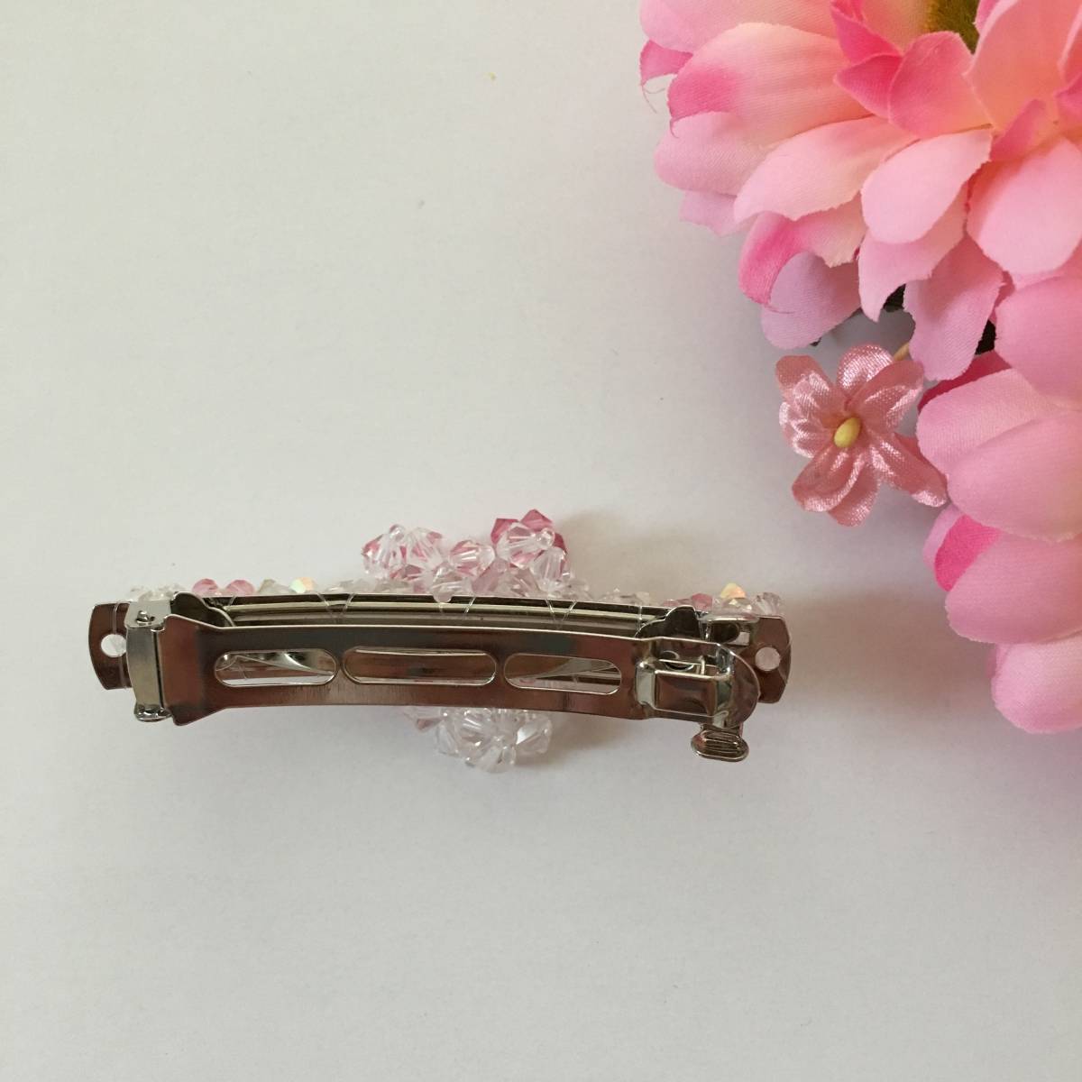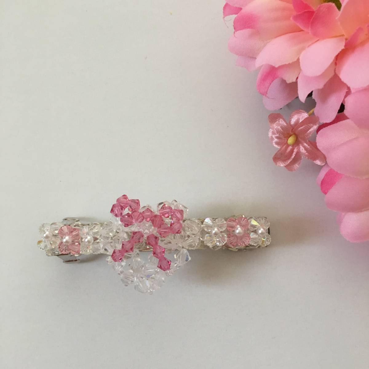 ハンドメイドのビーズアクセサリー小物です。 こちらはスワロフスキーのリボンモチーフバレッタ(白&ピンク)です。 サイズは約7×1(モチーフ含めず)×高さ2.5㎝です。 バレッタとビーズはテグスでくっつけております。 素人の作品ではありますが,丁寧にひとつひとつ作ったものになります。 右上のピンクの花は撮影用小物ですので商品には含まれません。 |