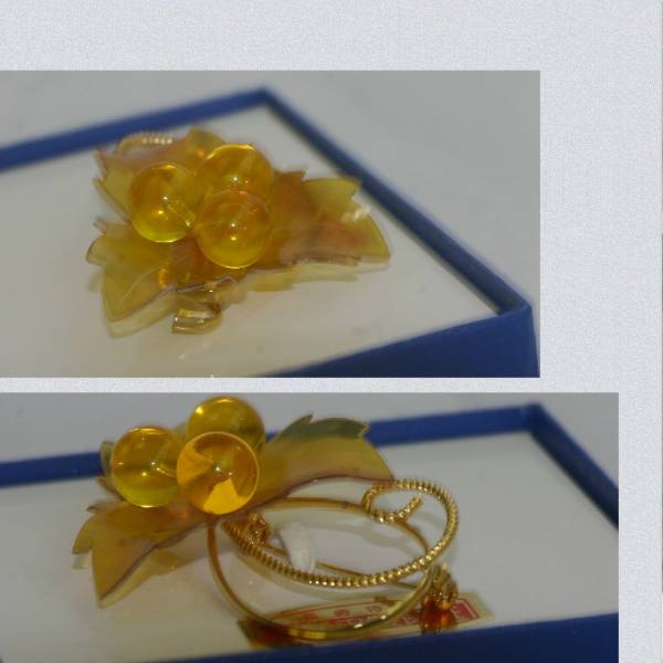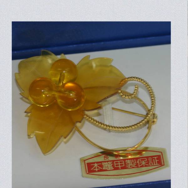 ブローチ | 長崎鼈甲会館の本鼈甲のブローチの出品です。3枚の花びらの中に玉が付いたデザインです。サイズは花びらが4x3,8cmで丸い部分の直径は1cmです。ブローチの金具を含めた下の金色金具の長さは4,4cmで付属品は元箱です。新品同様に綺麗ですのでお勧めです。管理番号○B11-125-2 |