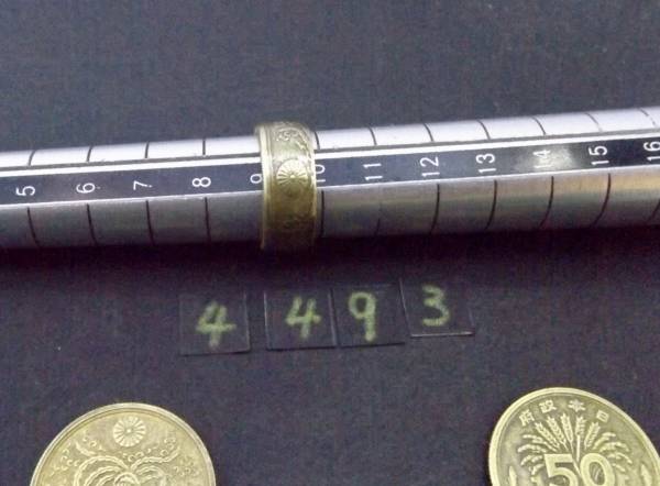 この商品は、昭和21年発行の 大型50銭黄銅貨を使用し、貨幣に穴を明け木槌で叩いてリングに成形した1点ものです。