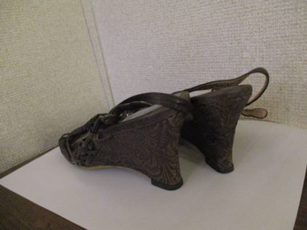 | 商品紹介 | 焦げ茶カラーのウエッジソールサンダルです。 ヒールの花柄の型押しがアクセントになっています。 |