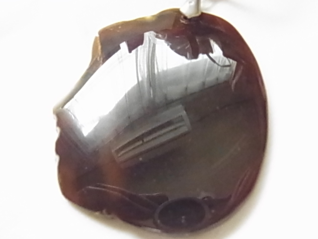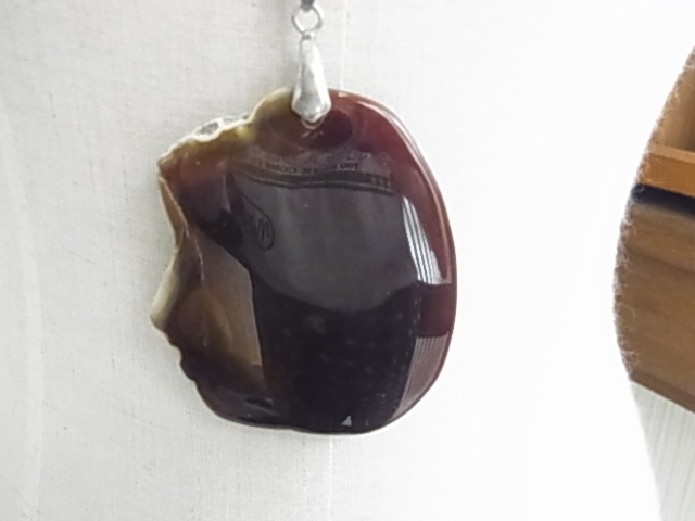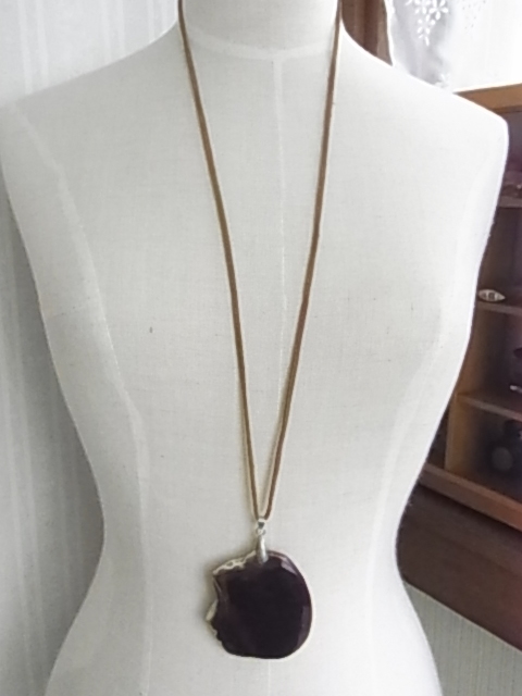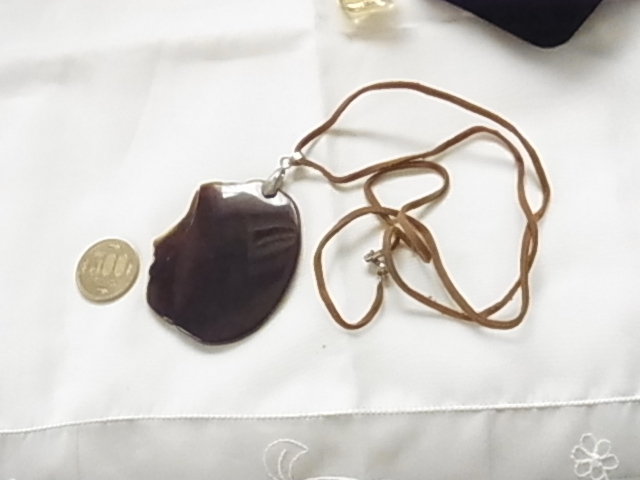 大きめのトップデザイン 人の横顔にようなトップ 茶系 ブラウン 革紐 ロングネックレス●●