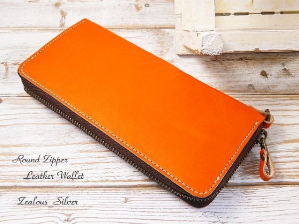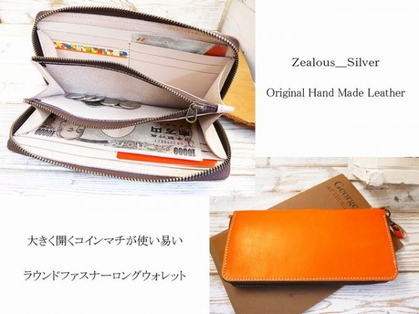 送料無料 コインマチが大きく開く!! ヌメ革 ラウンドファスナー ロングウォレット ハンドメイド 姫路レザー lwt60 手染めオレンジ