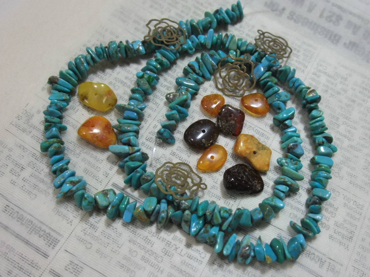 お色綺麗♪本ターコイズ本トルコ石アメリカ産と本琥珀ルースとアンティークビンテージデザインの真鍮パーツセット♪本琥珀のセット☆118⑤