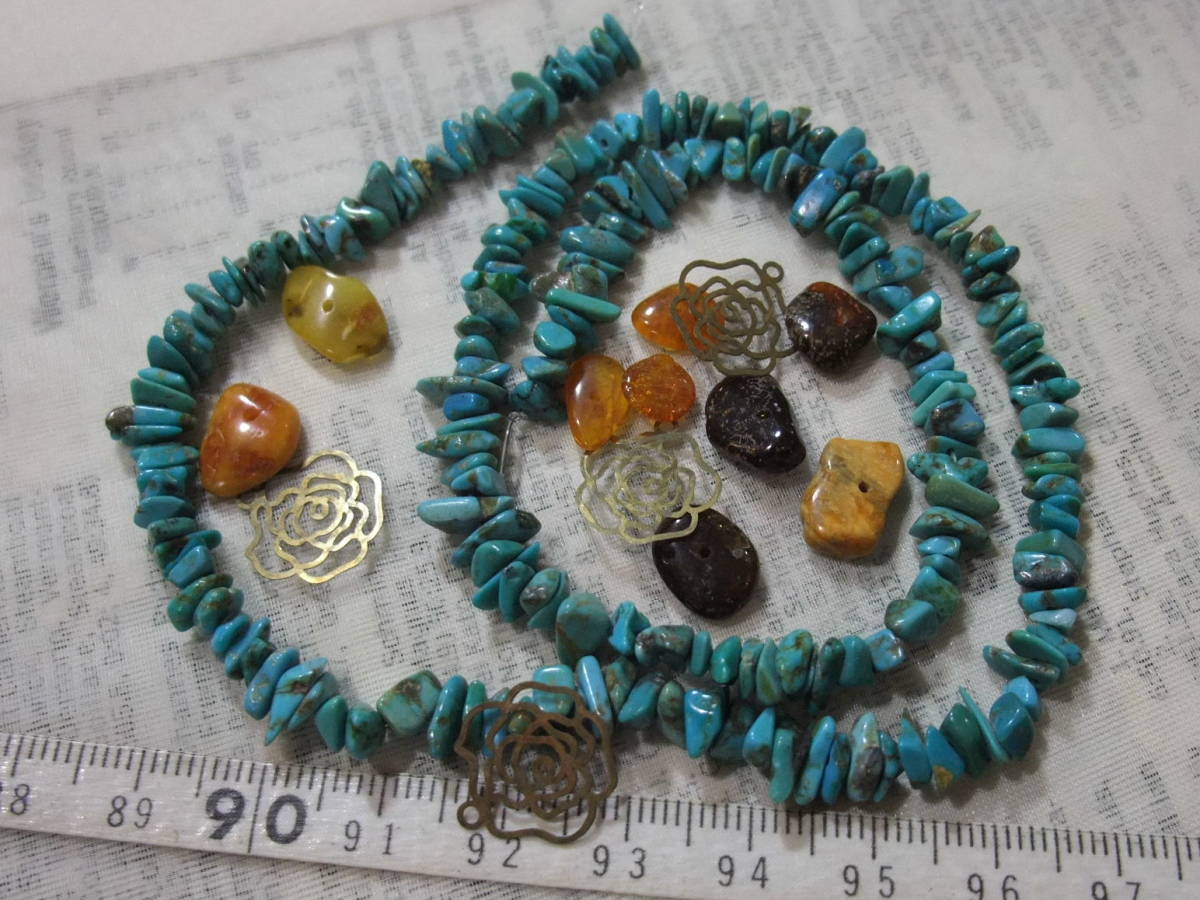 お色綺麗♪本ターコイズ本トルコ石アメリカ産と本琥珀ルースとアンティークビンテージデザインの真鍮パーツセット♪本琥珀の平タンブルなフリーシェイプのルースは一番人気のハニカム色も必ず一つは入ったお得なセットです♪ターコイズはなかなか高品質な小粒の薄平さざれ系の本ターコイズ連材で、人気のアメリカ産の約40cm1本です☆このお値段なら初心者の方でも気軽に本物で製作できる、リーズナブルで安価なお薦めセットです☆