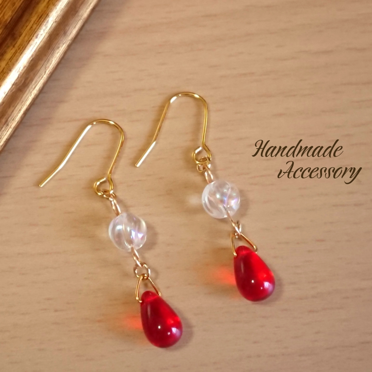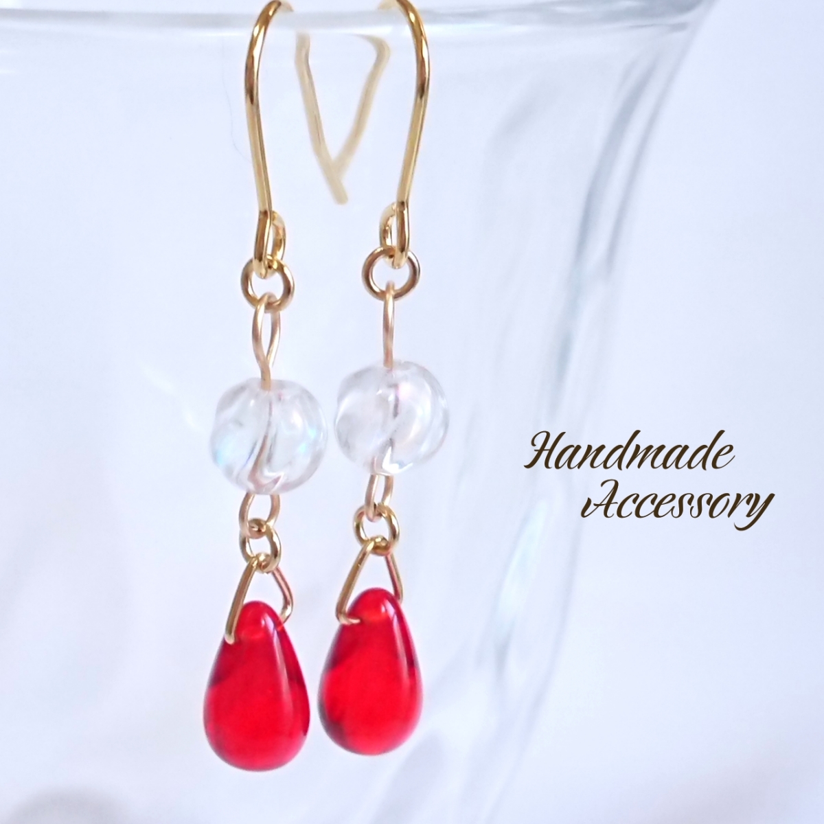 Sラインカットが施されたアクアクリスタルの下にシャムレッドクリアカラーのチェコドロップを繋げた揺れるピアスです。