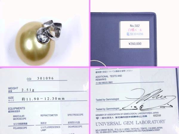 素材: | ホワイトゴールド:K18WG(刻印あり) メレダイヤ:0.04cts(刻印あり) パール:白蝶(ゴールド色) | 付属品: | 鑑別書 発行:UNIBERSAL GEM LABORATORY | ||||||||||