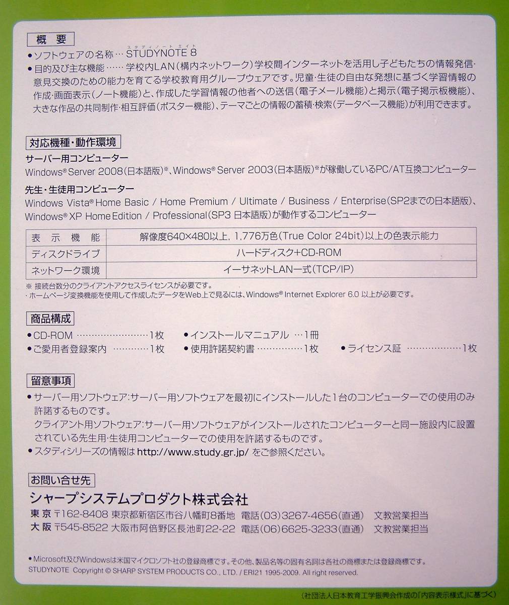 【3113】 シャープ StudyNote v8 スクールライセンス 新品 未開封 Sharp スタディノート Windows用ソフト 学校(教育 学習)用グループウェア